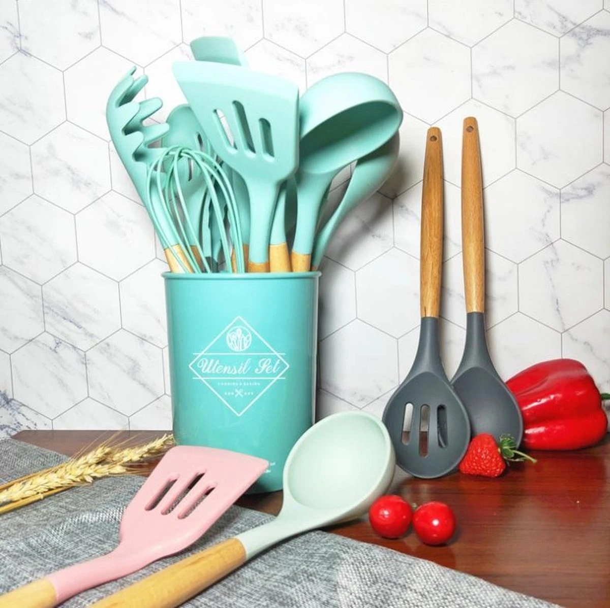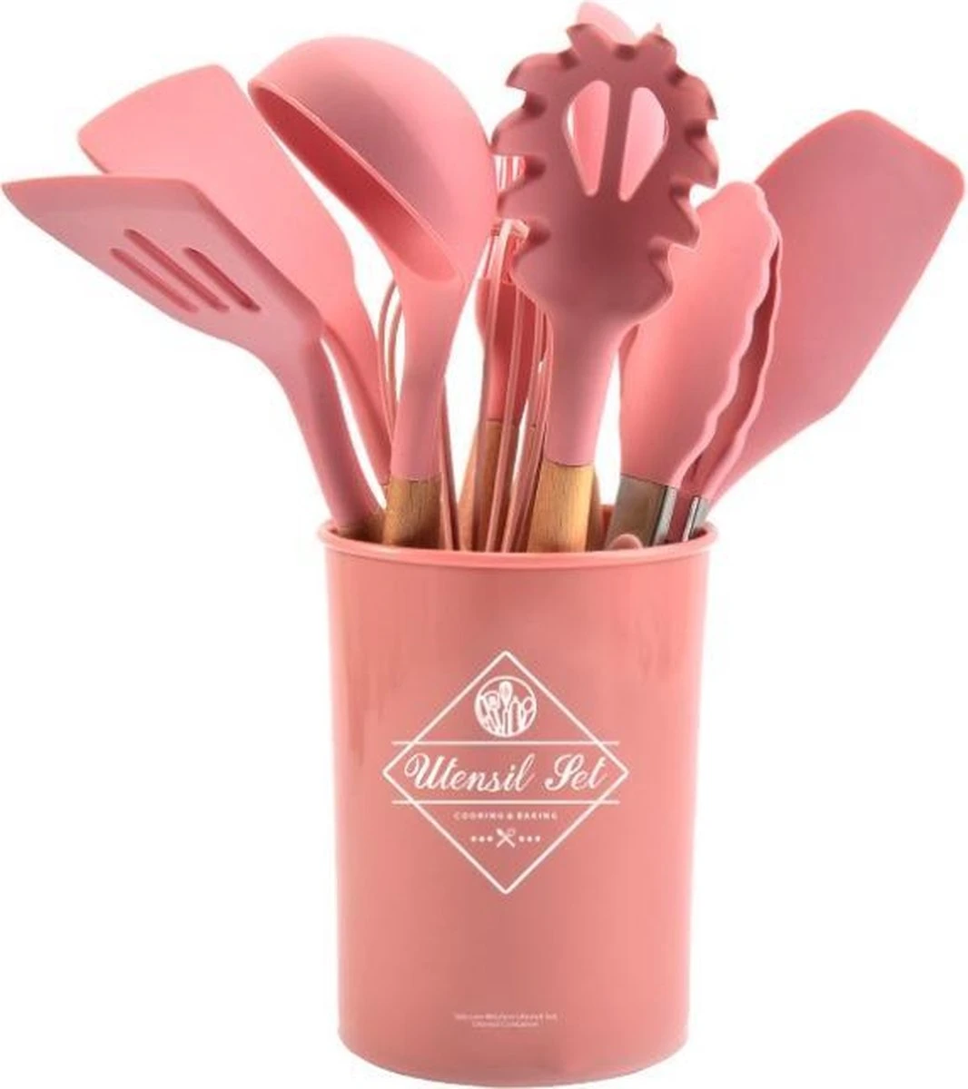 12-delige Itagala Siliconen Keukengerei Set Met Koker |Anti Aanbak | Hoge Kwaliteit Kookgerei Met Houten Handvatten | Pink | BPA En Kras Vrij
