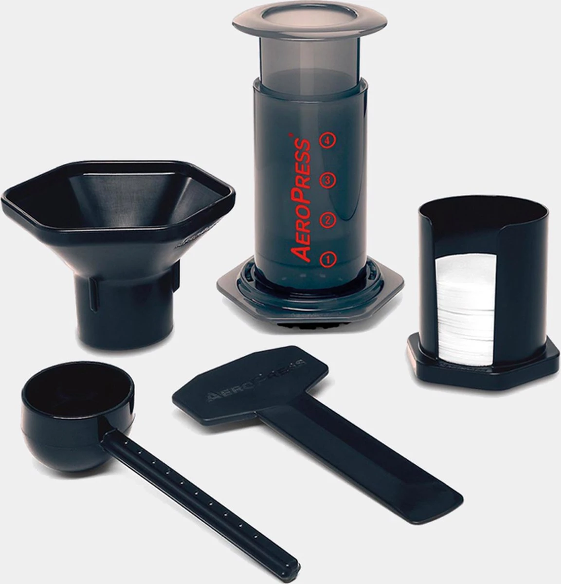 Heerlijke koffie zonder zuurgraad of bitterheid – waar u ook bent. Zet in ongeveer een minuut een tot drie heerlijke kopjes Amerikaanse of espresso-achtige koffie en het opruimen duurt slechts enkele seconden. Het is een geweldige aanvulling op elke keuken, maar omdat het duurzaam, lichtgewicht en compact is, is de AeroPress ook de perfecte metgezel tijdens reizen, kamperen of gewoon naar je werk gaan. De delen van de AeroPress die u zou meenemen (de kamer, de plunjer, de filterdop en papieren microfilters)Bevat: