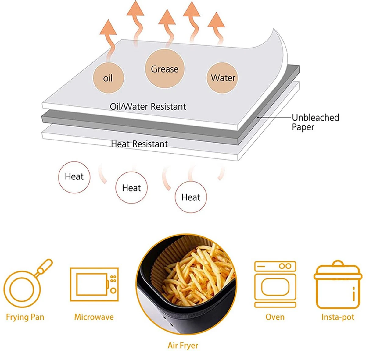 Het Airfryer papier is oliebestendig, waterdicht, ook heeft het papier een antiaanbaklaag waardoor het minder makkelijk beschadigd en is daarom geschikt voor al uw bakbehoeften.