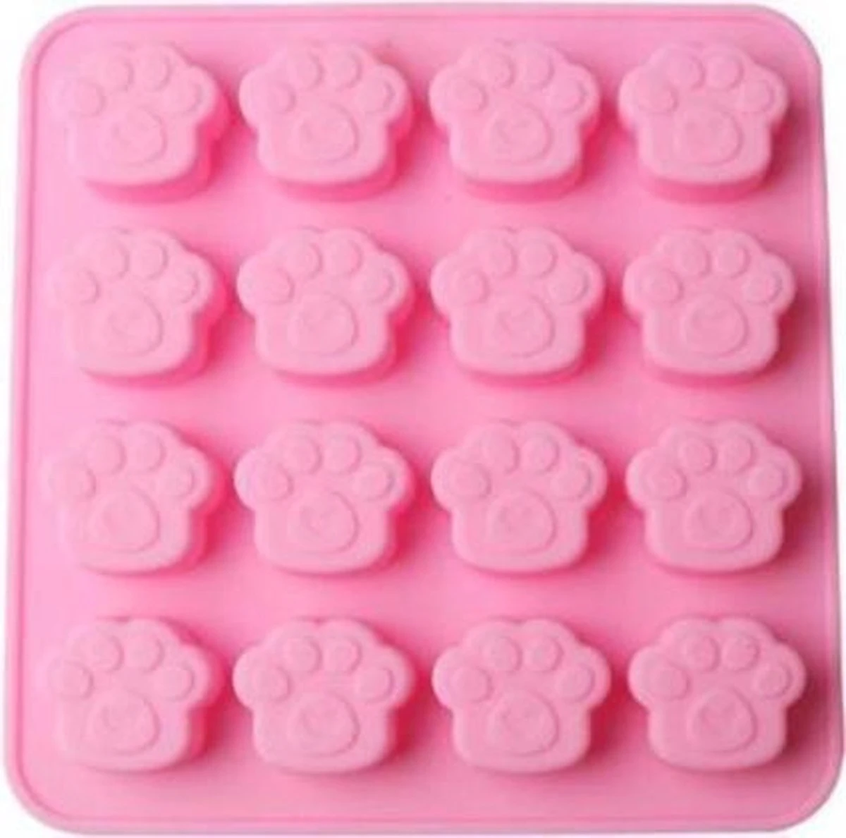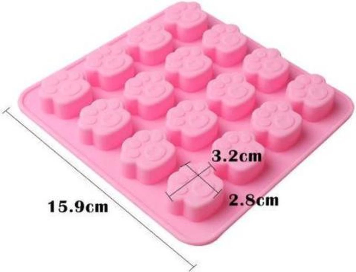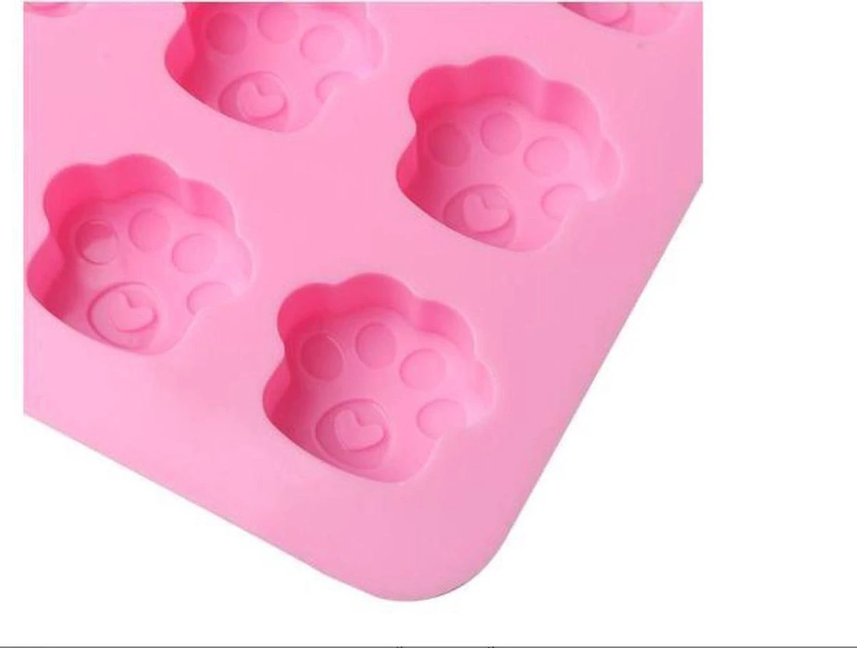 Siliconen vorm met Katten/Honden pootjes. Door de flexibele vorm kun je de vulling er gemakkelijk uithalen. In totaal zitten er 16 pootjes in 1 vorm. De vorm is onder andere te gebruiken als ijsblokjesvorm, chocoladevorm, fondantvorm.De vorm kan in de vaatwasser.