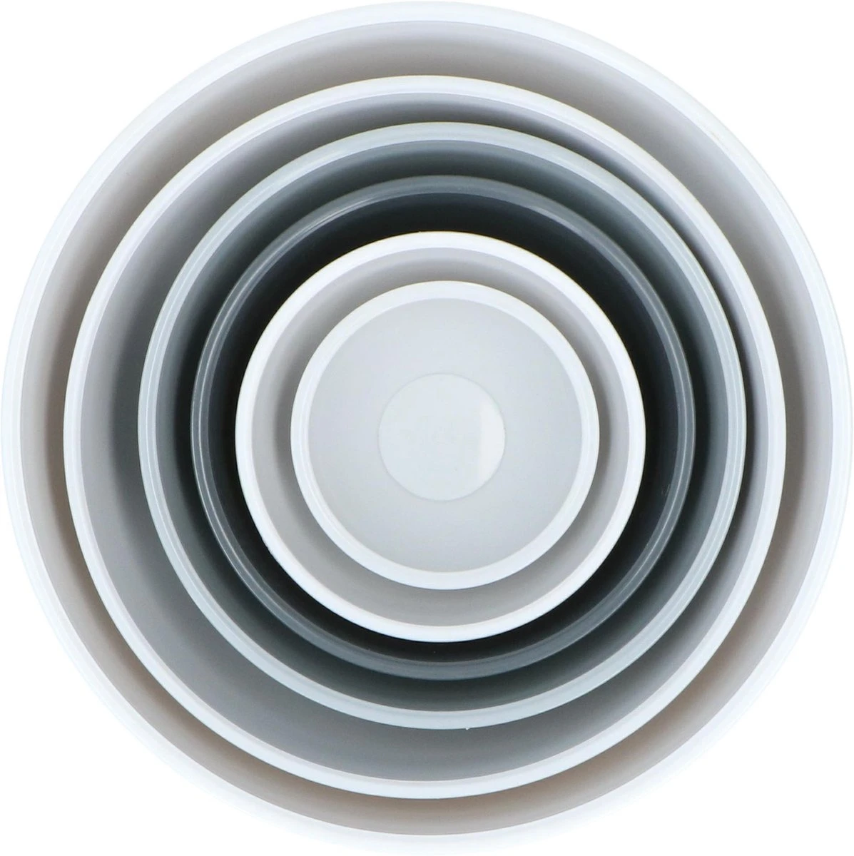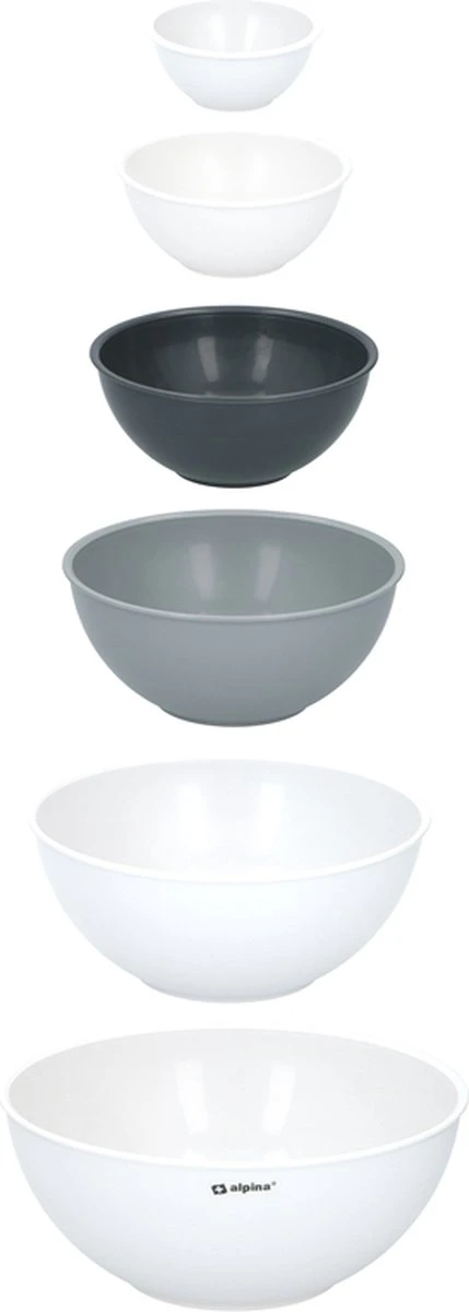 De 6 mengkommen passen netjes op volgorde van grootte in elkaar dus opbergen gaat gemakkelijk en compact. Qua vormgeving en de uitvoering in wit en verschillende grijstinten passen ze in elke moderne keuken.