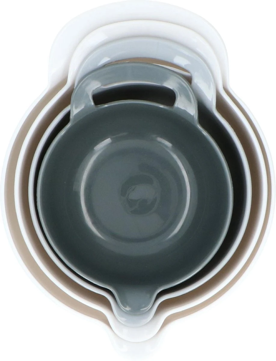 Elke beslagkom is voorzien van een anti-slipring aan de onderkant zodat hij keurig op het aanrecht blijft staan terwijl je aan het mixen of kloppen bent. De mengkommen passen netjes op volgorde van grootte in elkaar dus opbergen gaat gemakkelijk en compact. Qua vormgeving en de uitvoering in wit en verschillende grijstinten passen ze in elke moderne keuken.