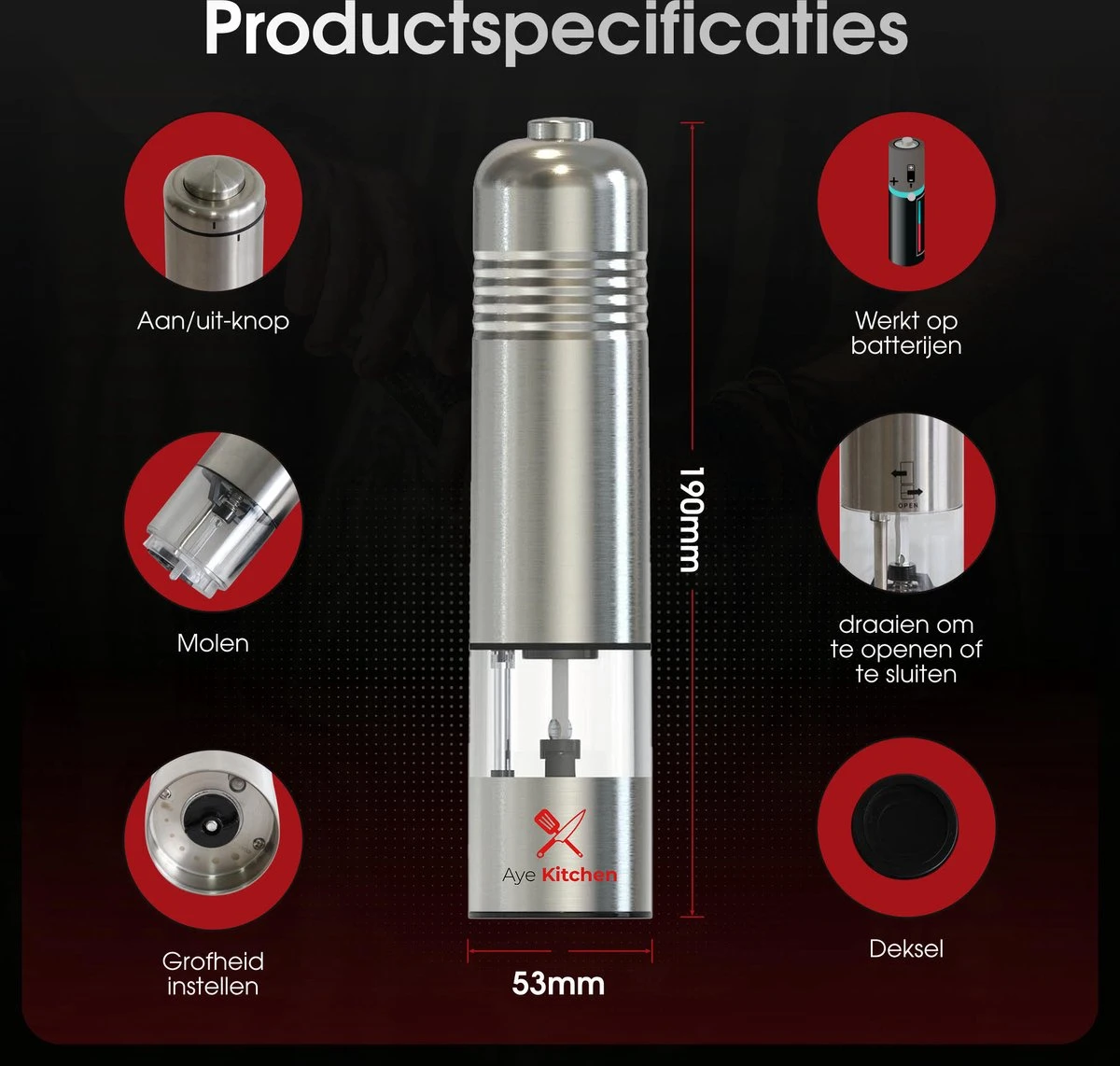 Op zoek naar ultiem gemak in de keuken? Met de elektrische Aye Kitchen Peper en Zoutmolen Set hoef je niet meer met twee handen te draaien om je favoriete gerecht te voorzien van een snufje peper en zout. We gebruiken in de keuken voor op onze gerechten regelmatig peper en zout. Dit geeft de ultieme finishing touch om je eten op smaak te brengen. Met de krachtige Aye Kitchen Peper en Zoutmolen Set doe je dit gemakkelijk en snel met één hand.