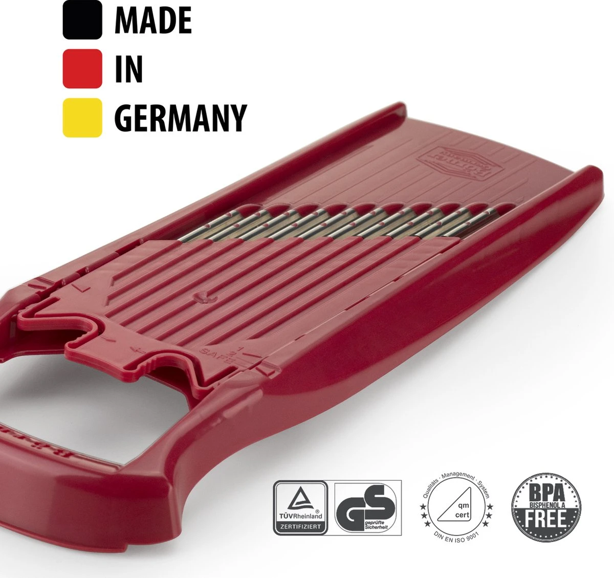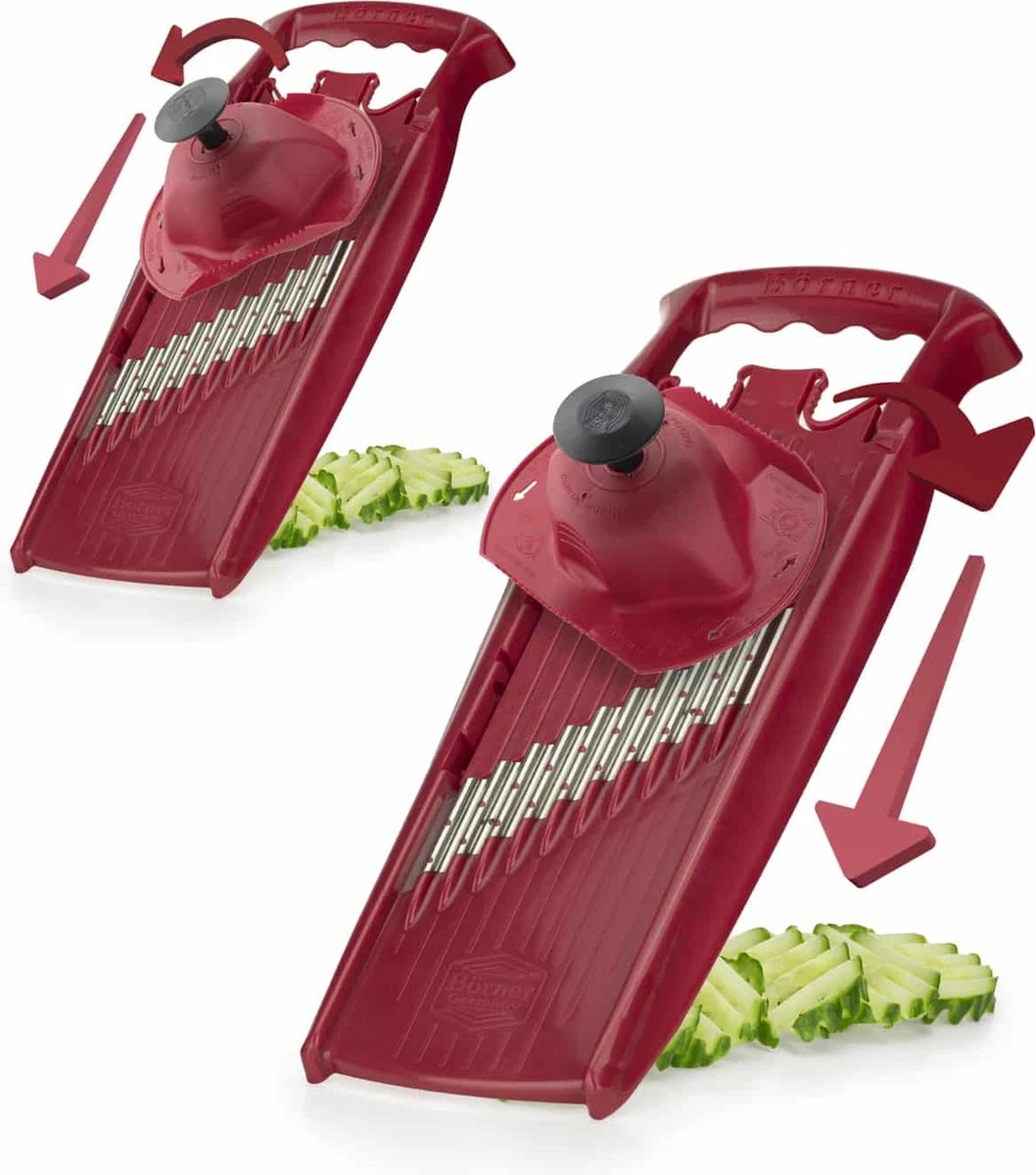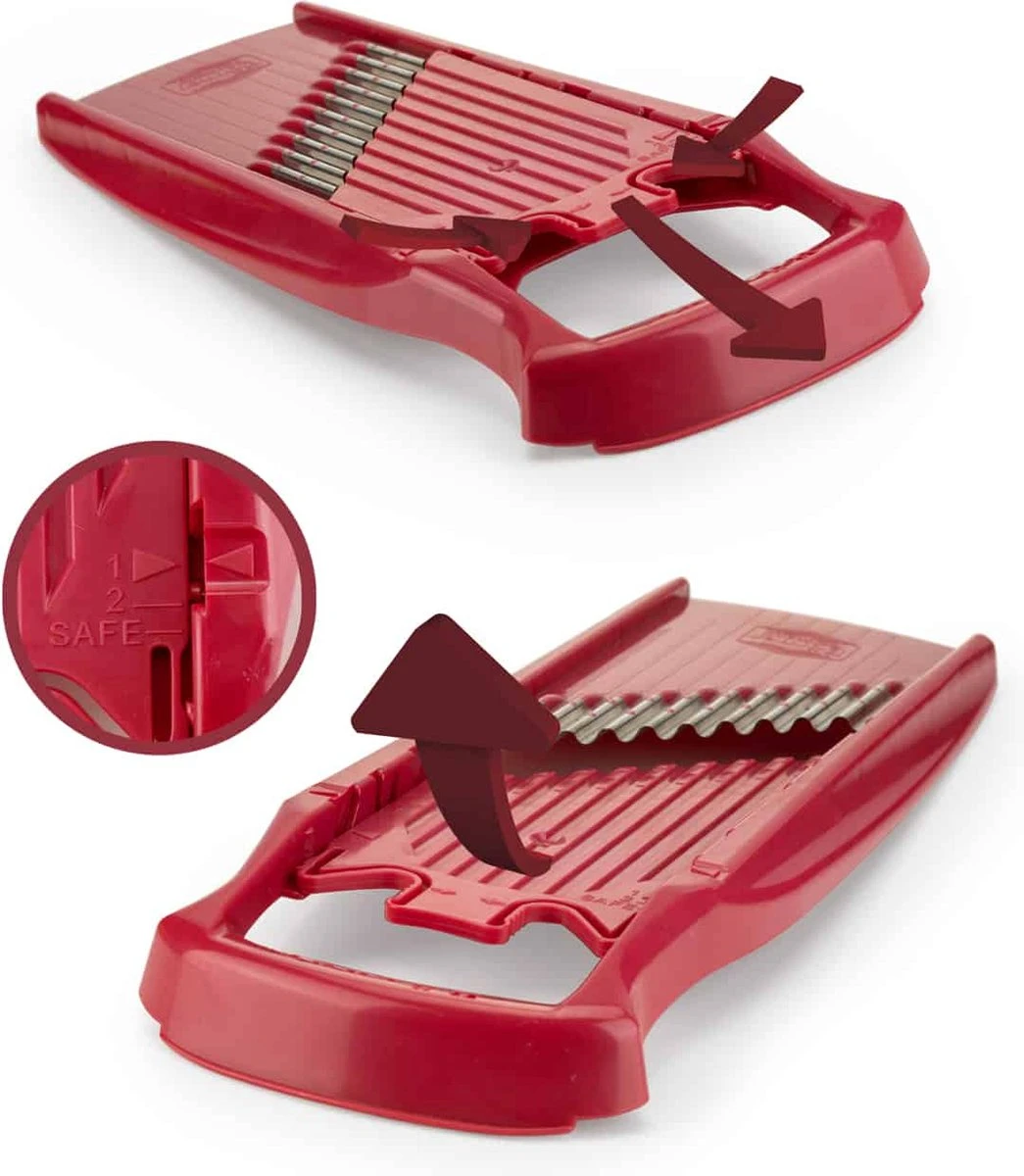 Dit leuke apparaat snijdt alle vaste groenten en fruit in een wafelstructuur (met gaatjes) of gekartelde schijfjes. Er zijn drie standen. Grof voor gekartelde, dikkere schijven, een fijne stand voor wafelstructuur en de stand helemaal dicht als veiligheid.