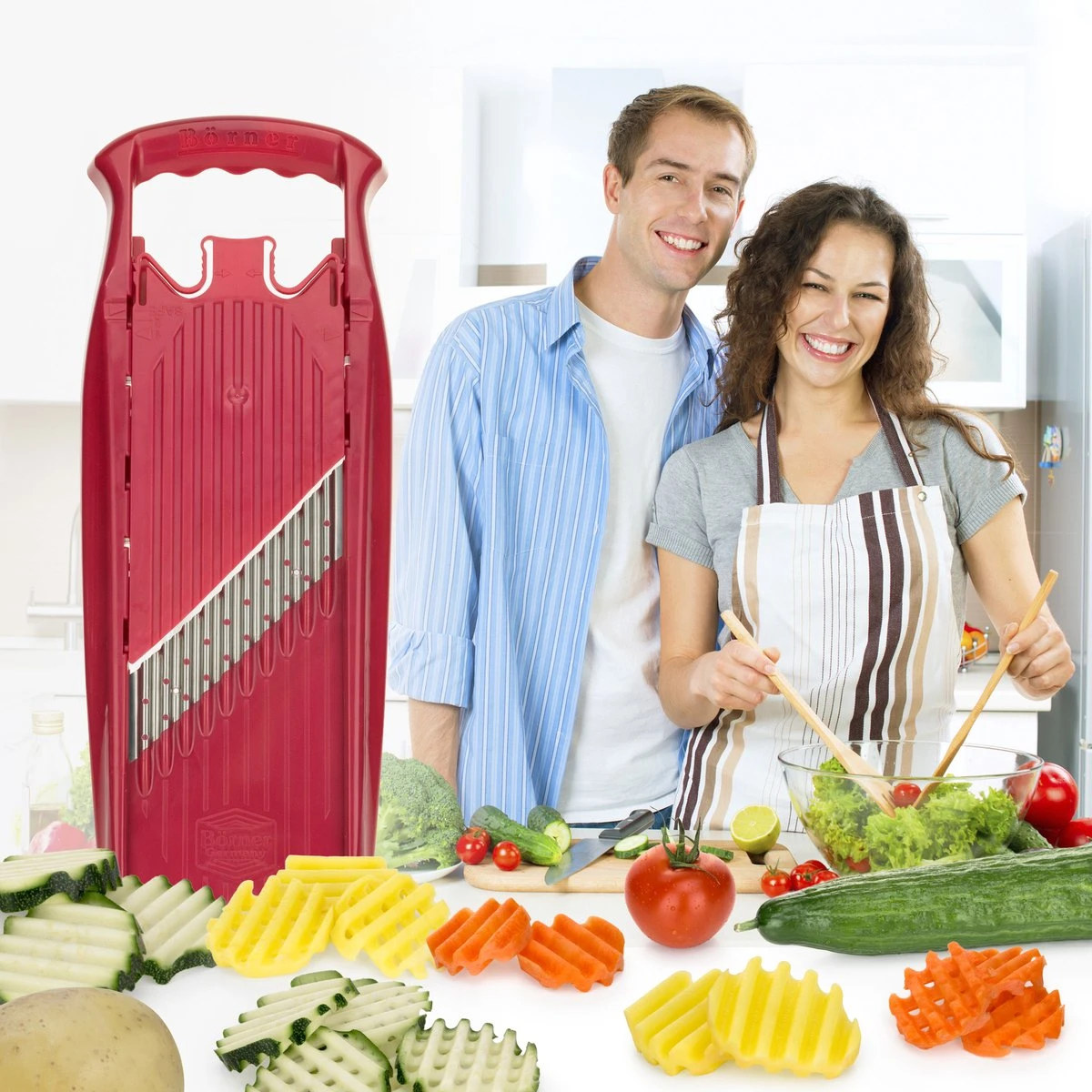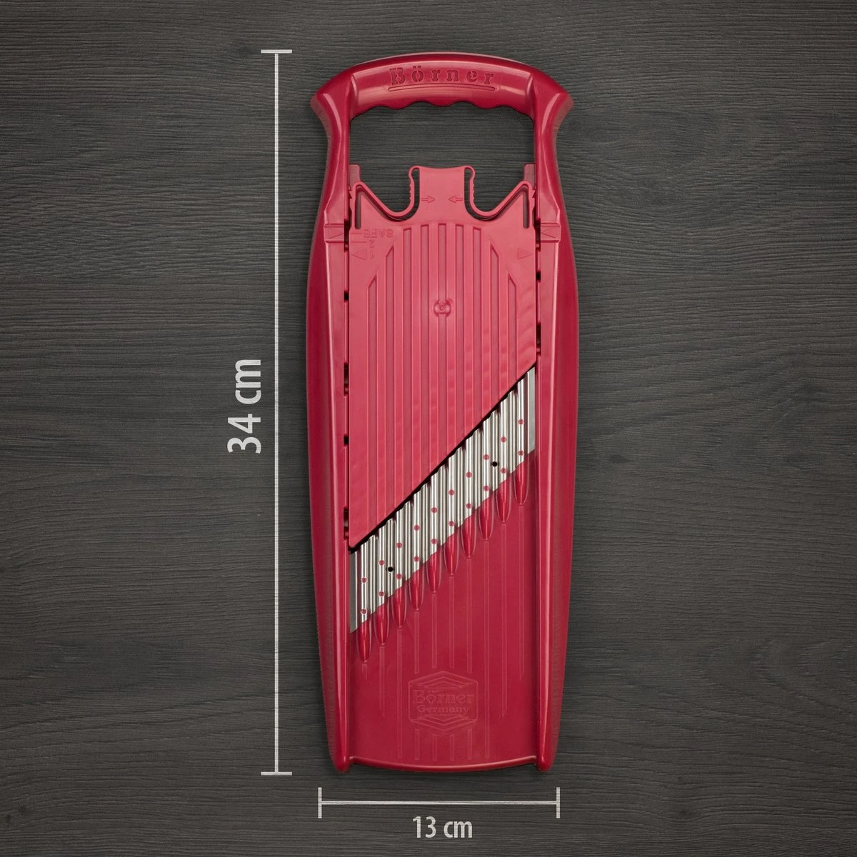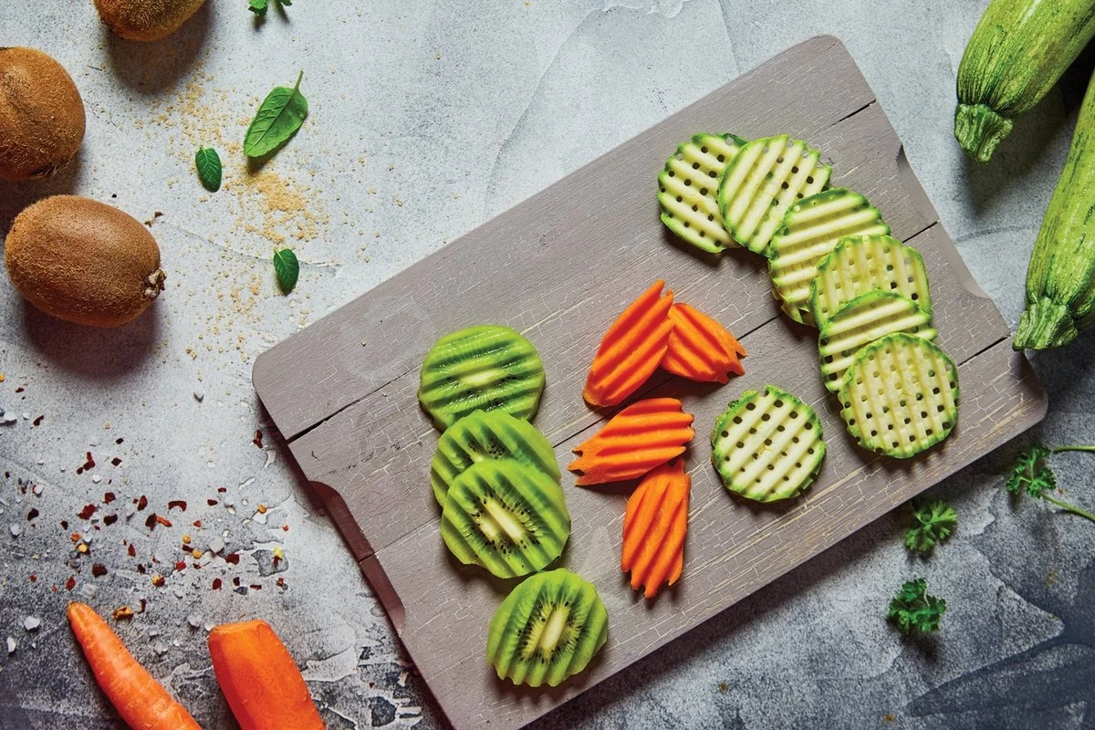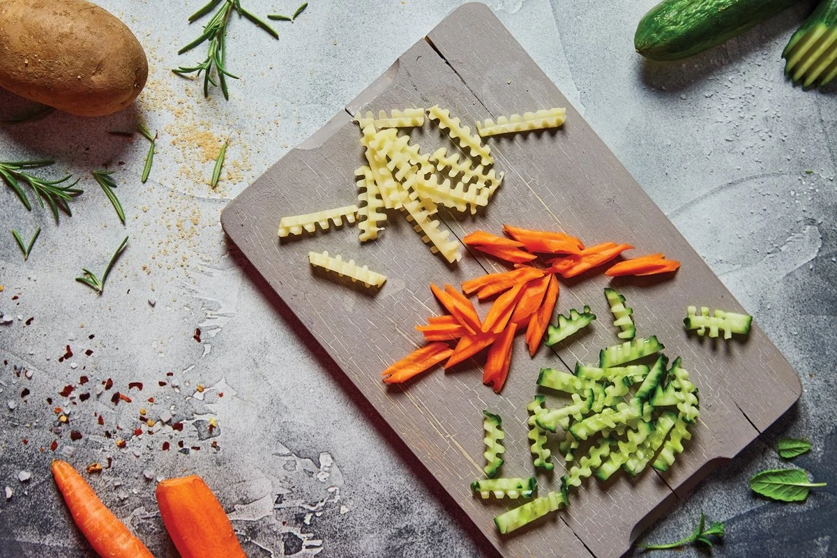Dit leuke apparaat snijdt alle vaste groenten en fruit in een wafelstructuur (met gaatjes) of gekartelde schijfjes. Er zijn drie standen. Grof voor gekartelde, dikkere schijven, een fijne stand voor wafelstructuur en de stand helemaal dicht als veiligheid.