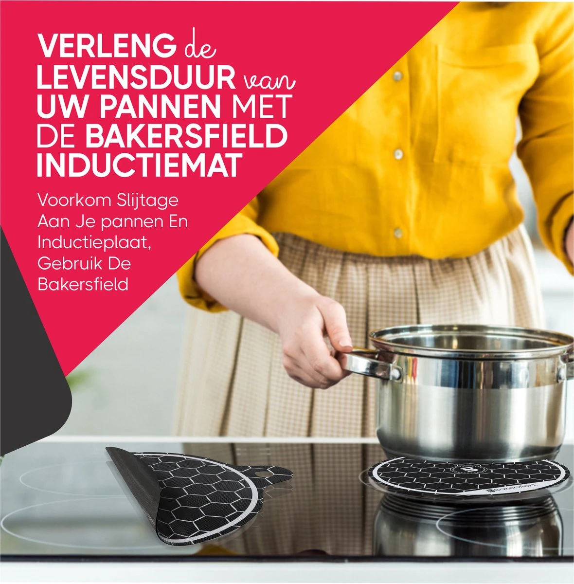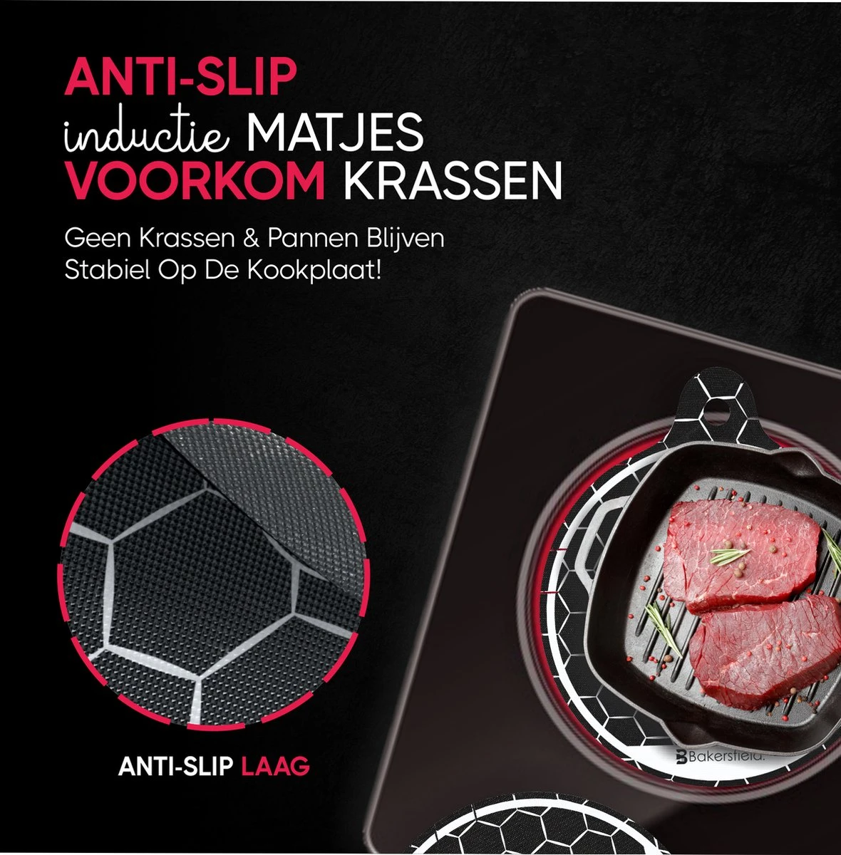 Enkel geschikt voor inductie kookplaten, tot 250 graden koken met de Bakersfield inductiematten. Weerstaat hoge hitte afkomstig van de kookplaat.