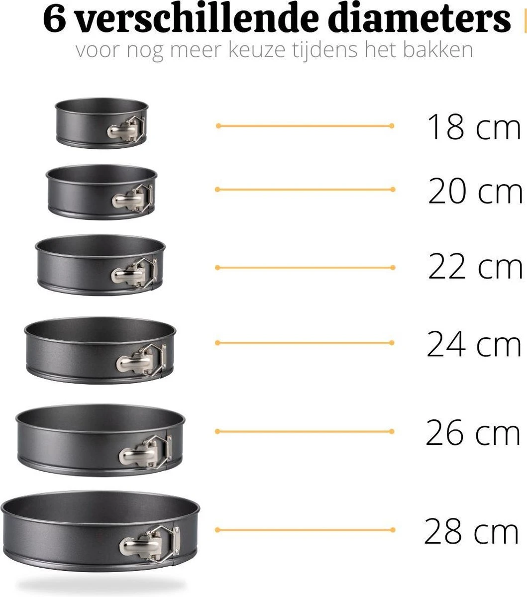 Sta jij graag in de keuken om taarten te maken? Met de 6-delige ronde springvorm set van Bakiez maak je perfecte ronde taarten in allerlei maten, groot en klein! De set bestaat namelijk uit 6 RVS springvormen met een diameter van 28, 26, 24, 22, 20 en 18 cm. Dankzij de losse bodem en anti-aanbaklaag kun je jouw taart er na het bakken weer makkelijk uit halen.