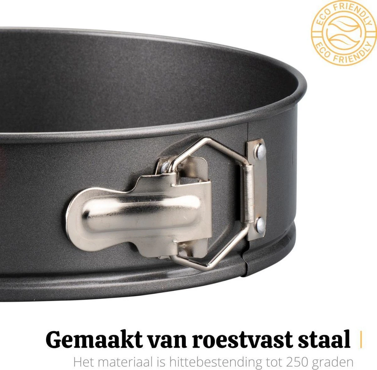De springvormen zijn gemaakt van roestvast staal. Het materiaal is hittebestendig tot wel 250 graden Celsius, ruim voldoende voor het bakken van taarten. Ook zijn de springvormen vrij van BPA. Je hoeft je dus geen zorgen te maken dat er door de hitte giftige stofjes in je taart terecht komen.