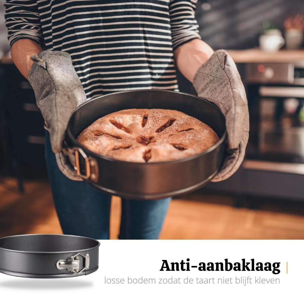 Om goed en makkelijk een taart te maken, heb je toch echt een springvorm nodig. De taartvorm zorgt er namelijk voor dat je taart tijdens het bakken zijn vorm behoudt. Het bakblik plaats je via een veersysteem boven op de bodemlaag. Als je klaar bent met bakken, klik je het veersysteem los en haal je het bakblik er weer vanaf. En ta da, je hebt een prachtige ronde taart gemaakt!