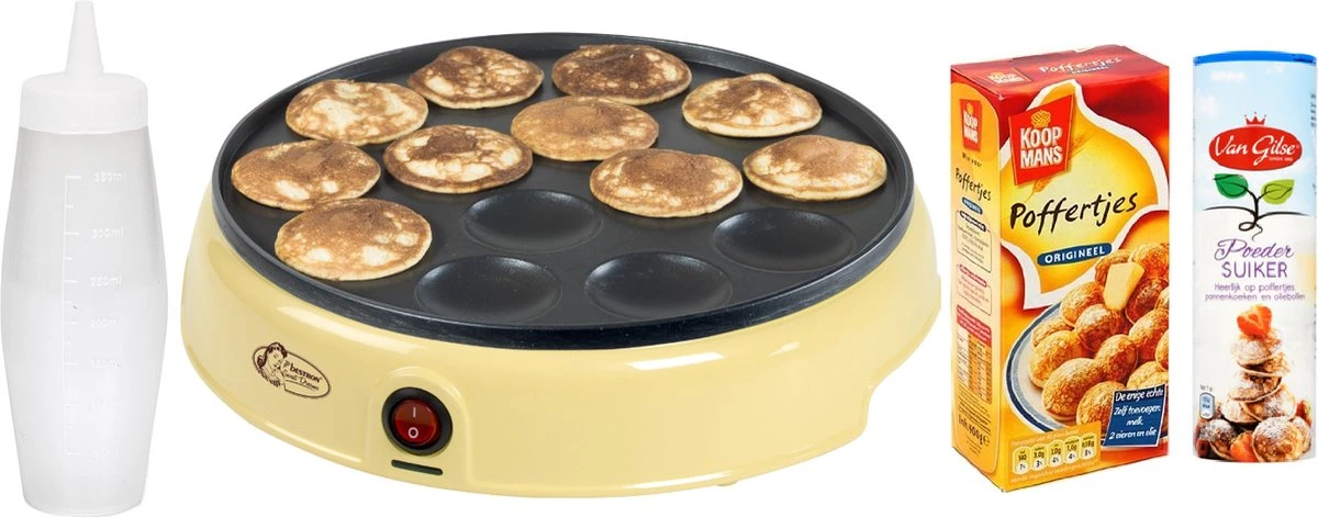Wil je liefhebbers van poffertjes bakken een mooi cadeau geven? Compleet met suikerpoeder, Koopmans poffertjesmix, beslagflesje, poffertjesvork en kwast voor invetten van de bakplaat. Ook leuk als kerstpakket, valentijnscadeau, verjaardagscadeau of sinterklaas / kerstcadeau voor hem en haar!