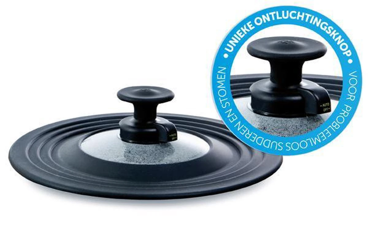 Let op: Het wordt aanbevolen de deksel te gebruiken op pannen op een elektrische- of inductiekookplaat. Bij gebruik op het gasfornuis kan de siliconen dekselrand eerder beschadigen.