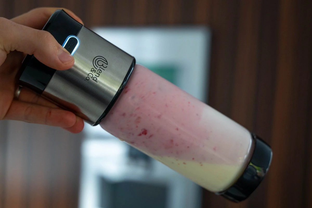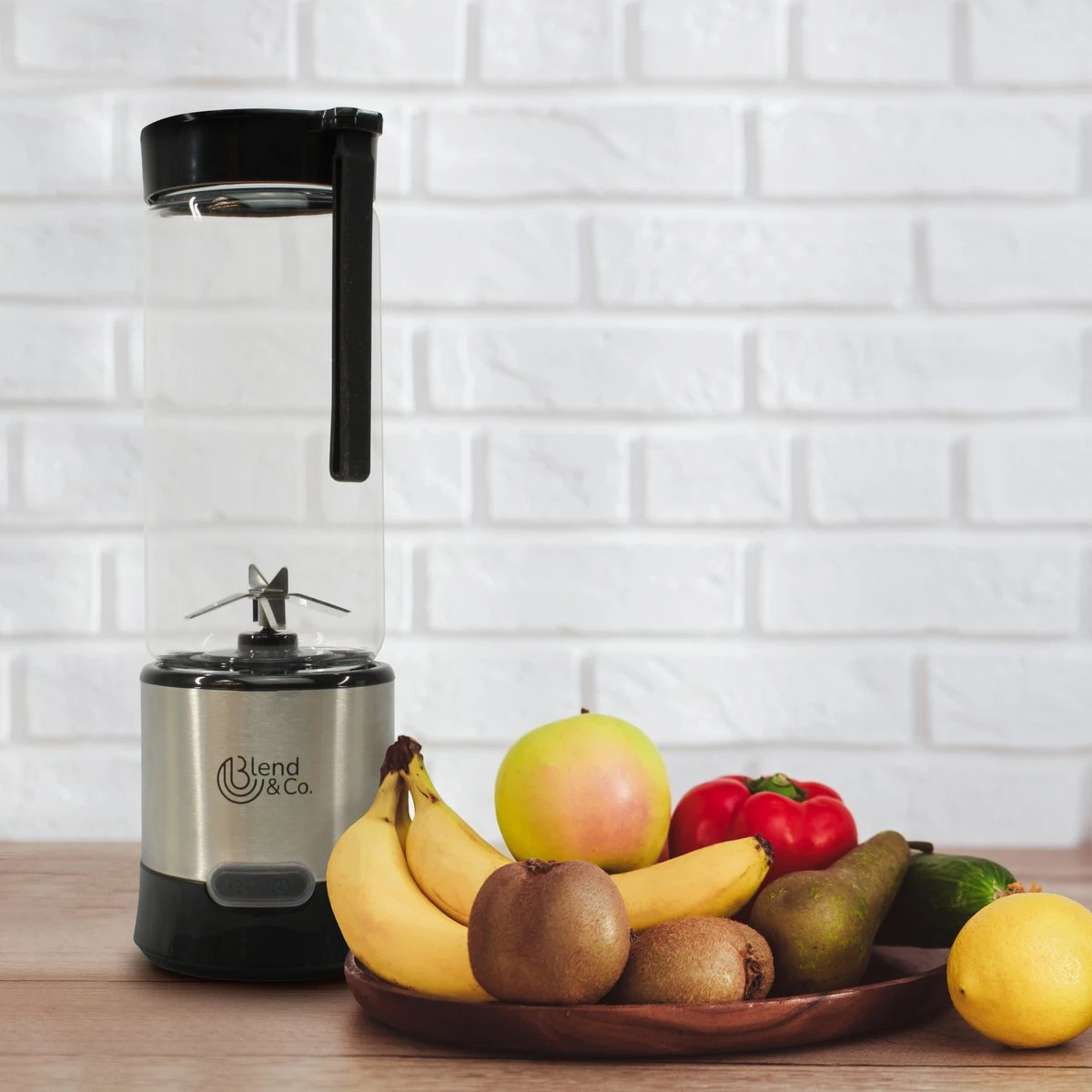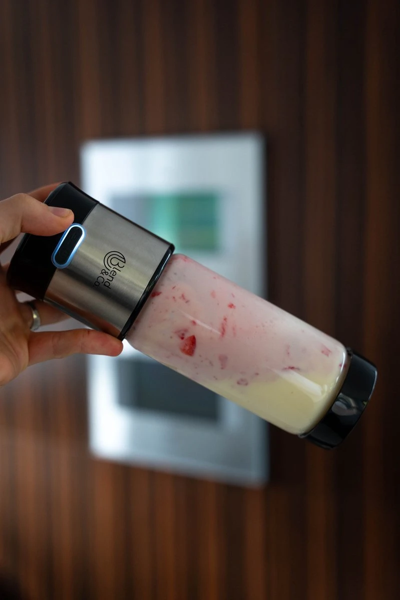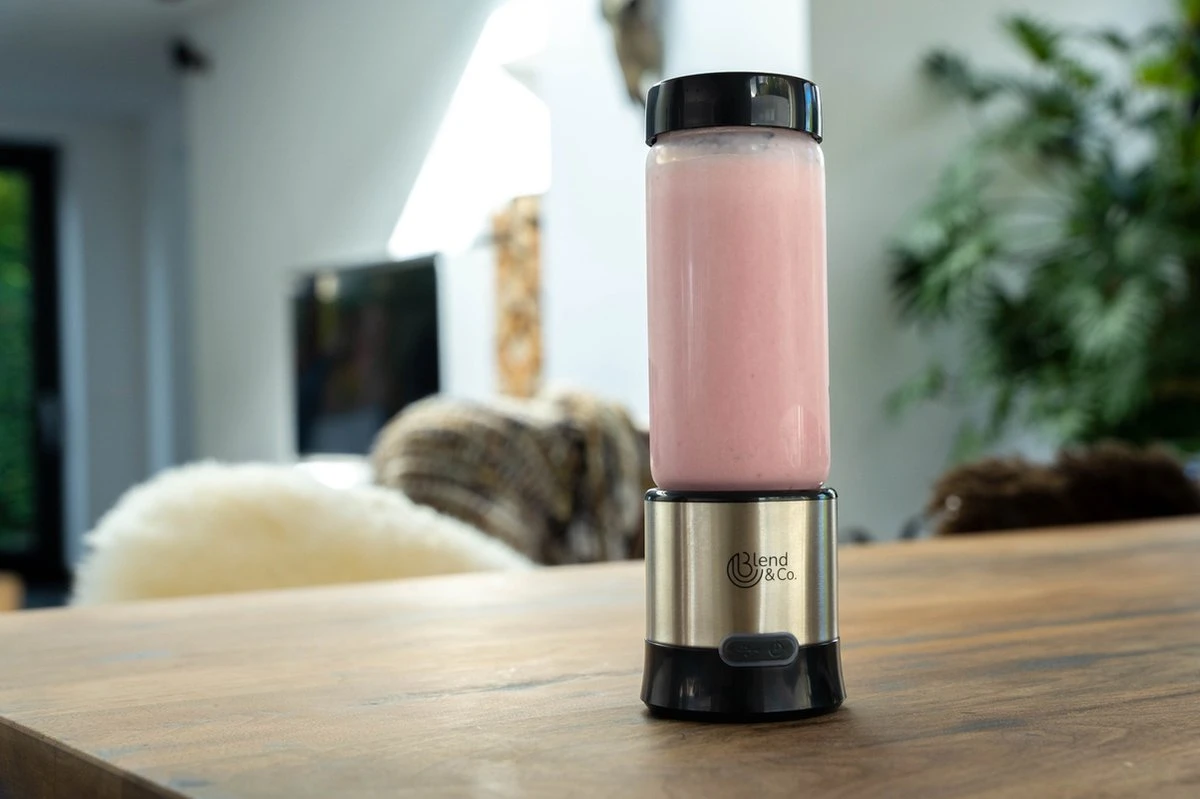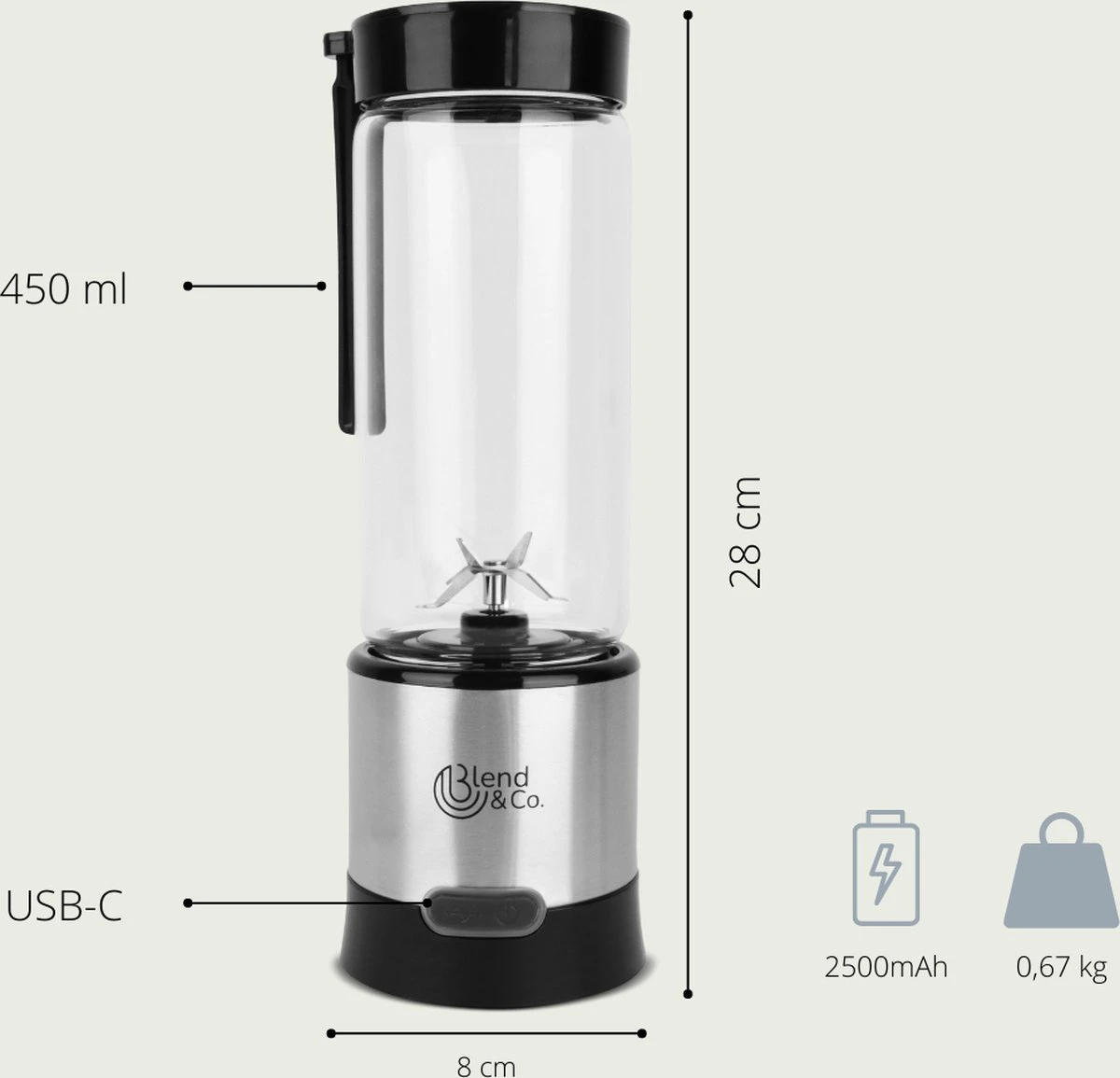 Geniet binnen één minuut van je smoothie met deze Blend & Co mini blender to go. Dankzij de 6 scherpe messen van roestvrij staal en de krachtige accu zijn ingrediënten binnen no-time samengevoegd tot een heerlijke smoothie. De blender werkt draadloos, waardoor je deze gemakkelijk meeneemt naar je werk, school, of het park. Dankzij de ice crush functie kun je zelfs bevroren fruit en ijsblokjes in de smoothie maker stoppen. De draagbare blender is oplaadbaar met een USB-C kabel. Je maakt de smoothie blender bovendien in een handomdraai schoon.