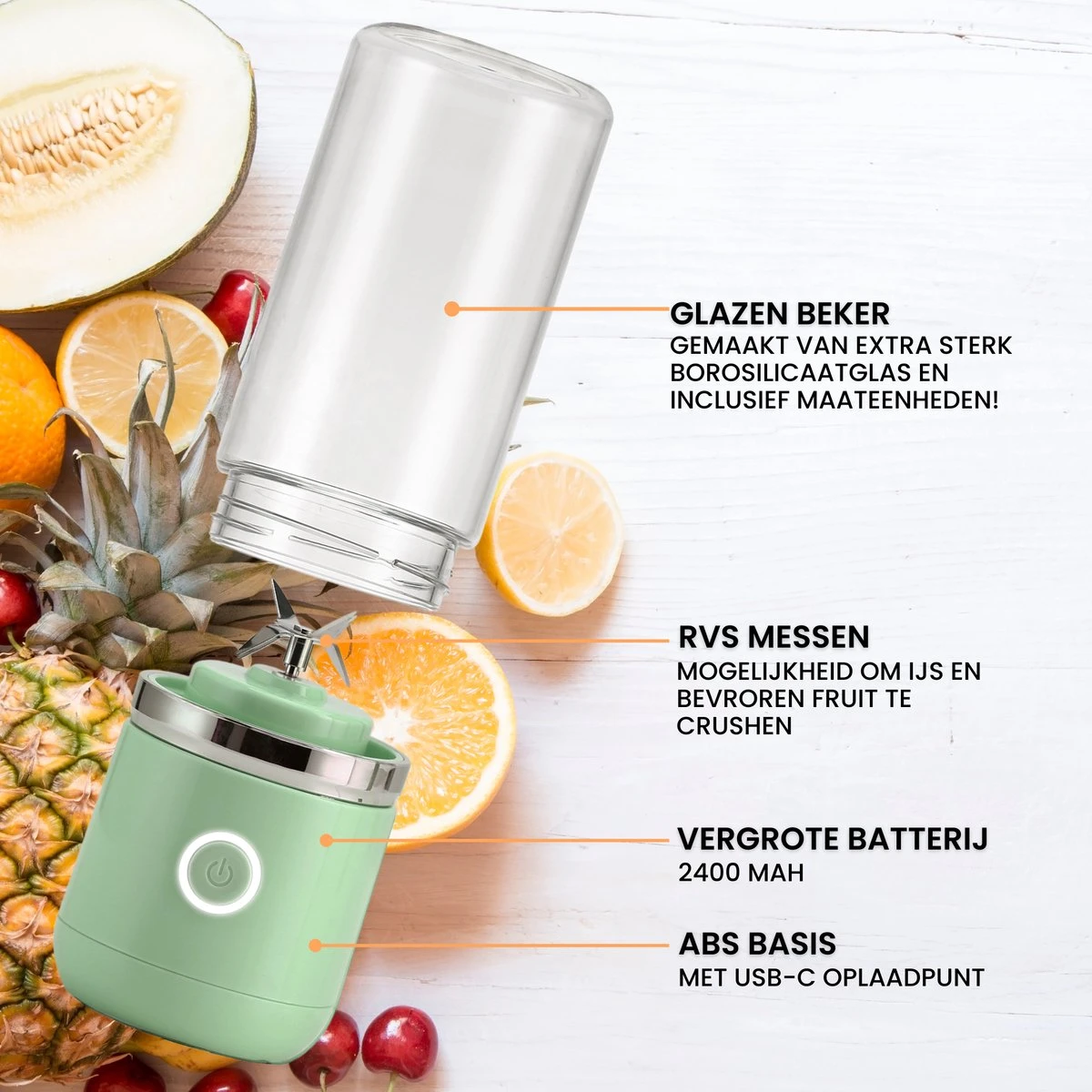De krachtige portable blender werkt perfect voor het maken van 1-persoons sapjes, smoothies en ijskoffie’s, pannenkoekenbeslag, babyvoeding en nog veel meer! Deze blender komt van pas op ieder moment van de dag, van ontbijt tot diner! Op ieder gewenste plek!