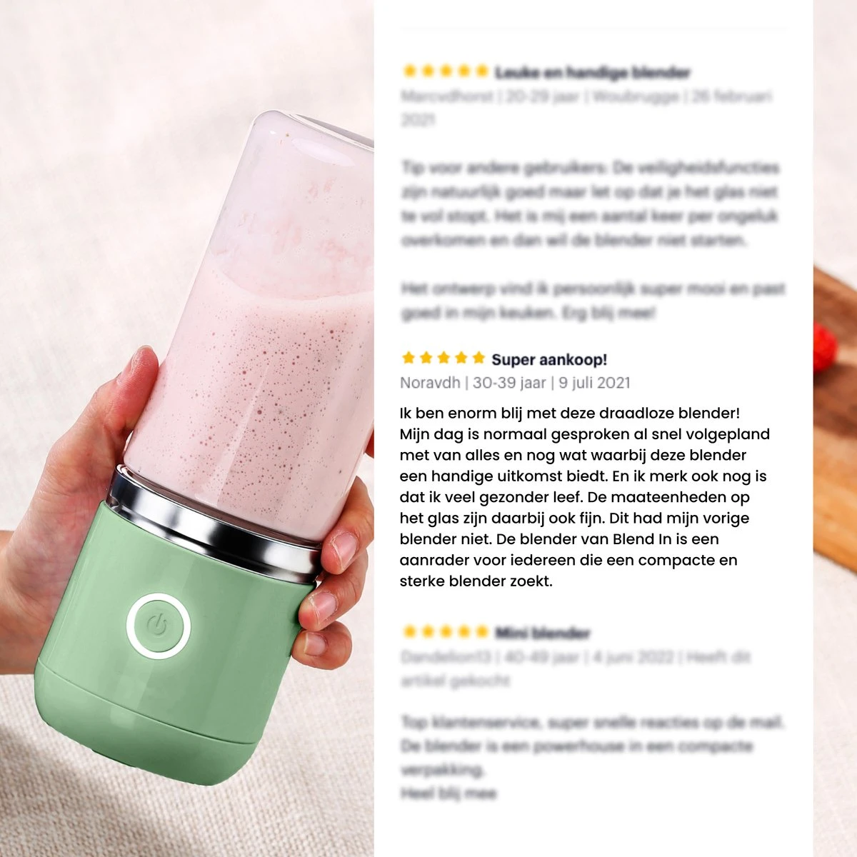 Het blijft een draadloze blender en heeft niet de sterkte van een keukenblender op stroom. Logisch! Pas hier het gebruik op aan. Om de blender to go zo optimaal mogelijk te gebruiken en de lekkerste shakes te bereiden is het aangeraden om vóór het toevoegen van de ingrediënten eerst de ingrediënten klein te maken. En ook tijdens het blenden niet al te hete vloeistoffen te gebruiken.