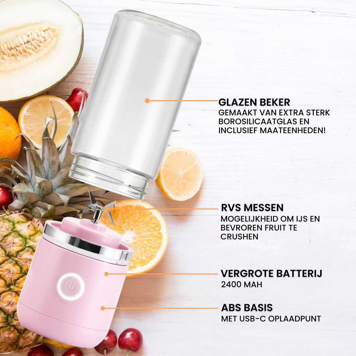 De krachtige portable blender werkt perfect voor het maken van 1-persoons sapjes, smoothies en ijskoffie’s, pannenkoekenbeslag, babyvoeding en nog veel meer! Deze blender komt van pas op ieder moment van de dag, van ontbijt tot diner! Op ieder gewenste plek!