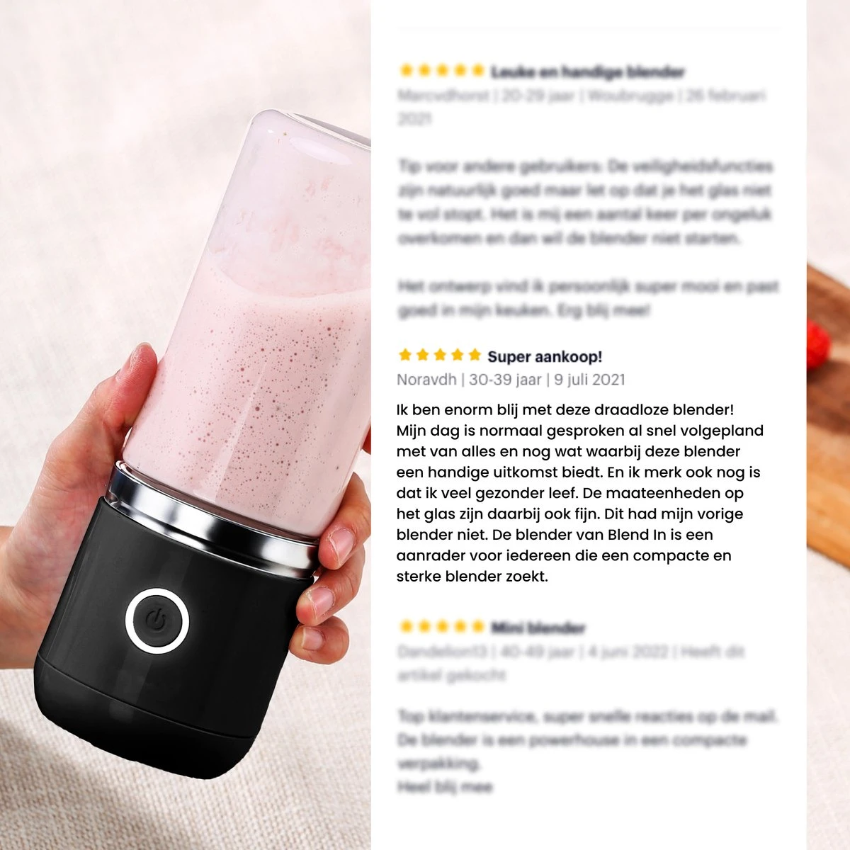 Het blijft een draadloze blender en heeft niet de sterkte van een keukenblender op stroom. Logisch! Pas hier het gebruik op aan. Om de blender to go zo optimaal mogelijk te gebruiken en de lekkerste shakes te bereiden is het aangeraden om vóór het toevoegen van de ingrediënten eerst de ingrediënten klein te maken. En ook tijdens het blenden niet al te hete vloeistoffen te gebruiken.