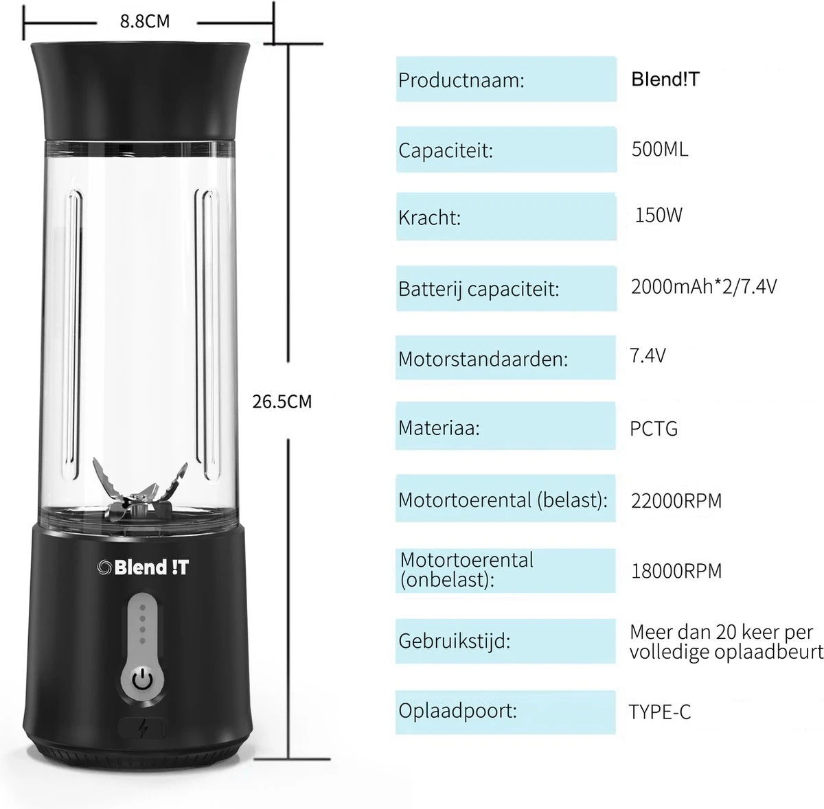 De draadloze mini blender is voorzien van een oplaadbare batterij met een grote capaciteit van 4000 mAh. Met een volledig opgeladen batterij kun je tot maar liefst twintig keer een heerlijk drankje blenden. Tijd om op te laden? Dat kan eenvoudig met de meegeleverde USB-C oplaadkabel.
