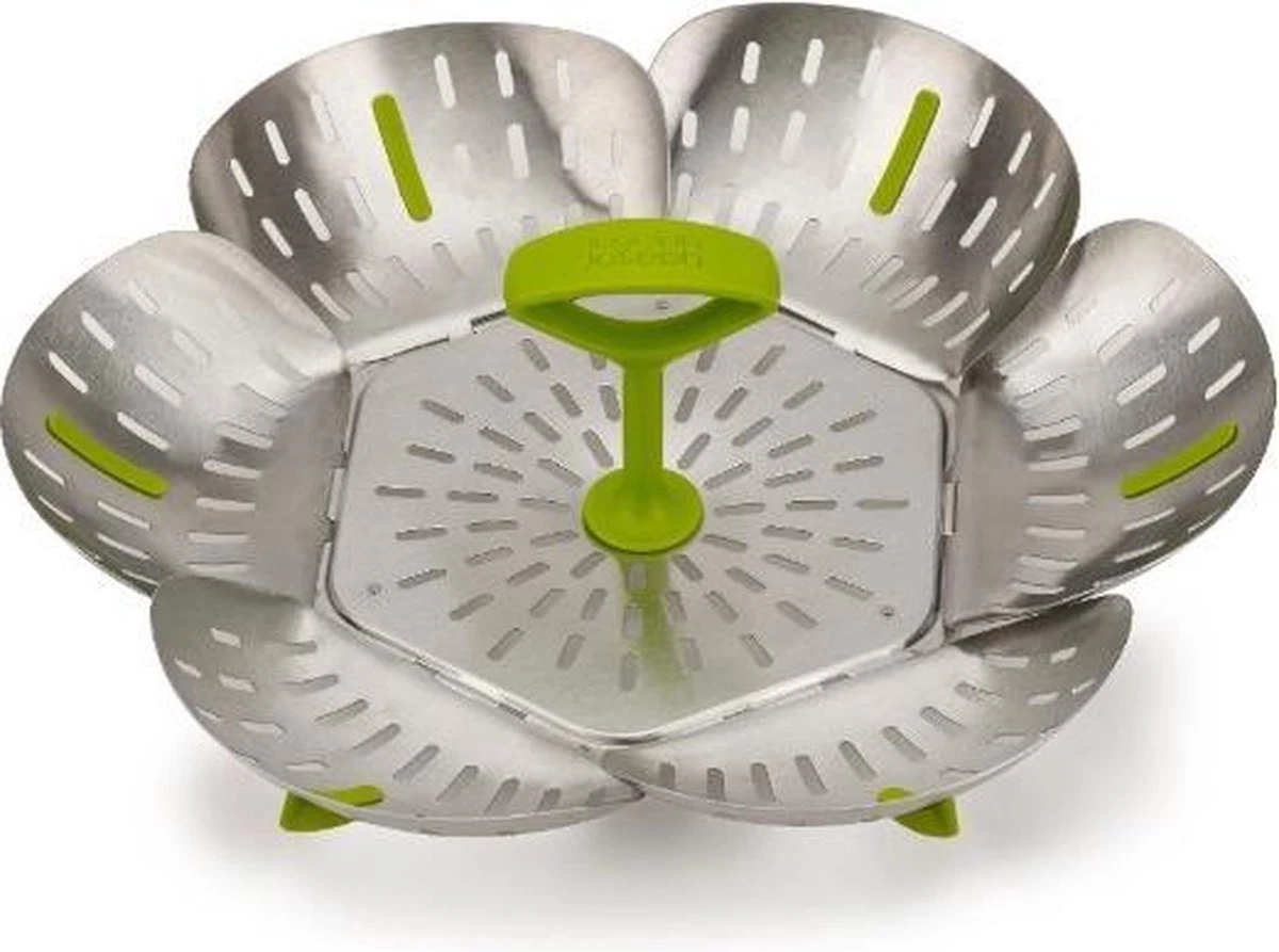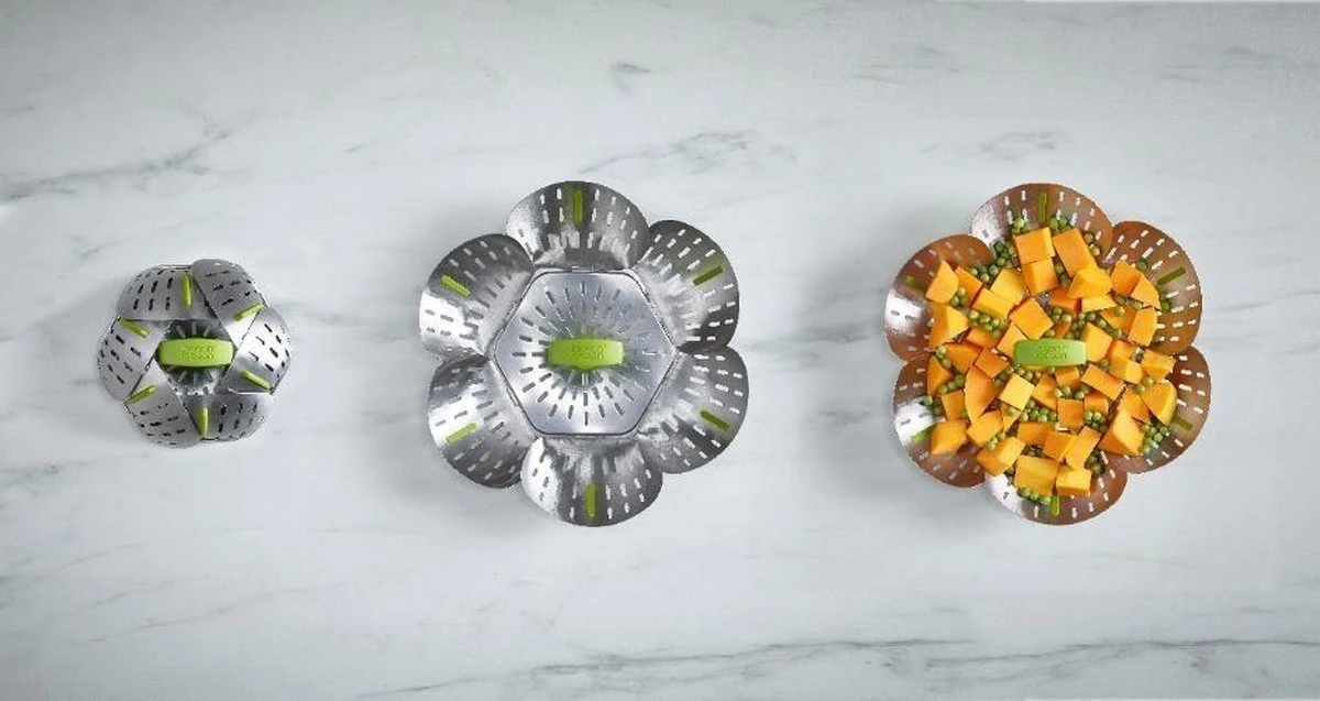 Voedsel stomen heeft vele voordelen. Zo blijven bijvoorbeeld de kleur, smaak en voedingsstoffen beter behouden dan wanneer je het kookt. Maar niet iedereen heeft de ruimte om een stoompan neer te zetten. Om die reden zou je ook voor deze opvouwbare stomer van Joseph Joseph kunnen kiezen. Omdat deze RVS stomer van 16 cm doorsnede opvouwbaar is, past hij in pannen van verschillende maten. De handgreep zorgt ervoor dat de stomer gemakelijk uit de pan gehaald kan worden. Kan gebruikt worden in zowel anti-aanbak als RVS pannen en is geschikt voor de vaatwasser.