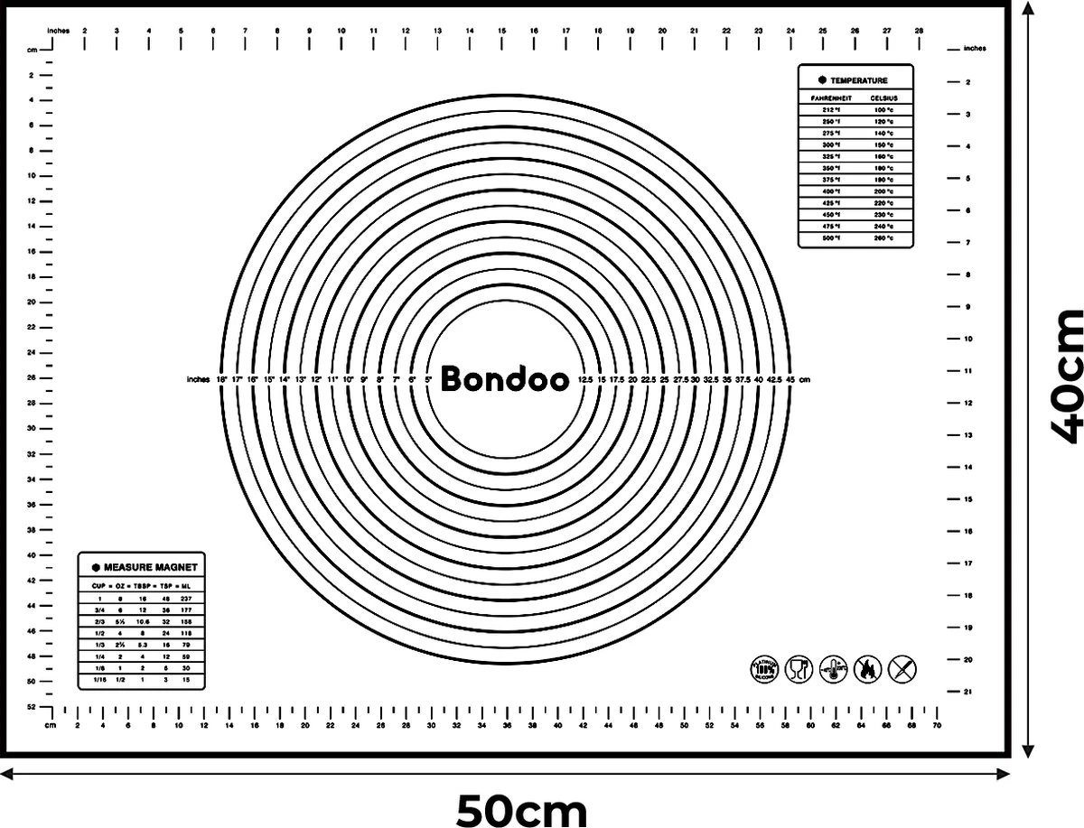 Bak je favoriete koekjes, taarten, cakes, cupcakes of muffins gemakkerlijk dan ooit met de Bondoo Siliconen Deegmat! Niks blijft meer plakken aan de anti-kleef mat. Neem hem gemakkelijk af met een doekje en hij is weer zo goed als nieuw! Deze siliconen bakmat is onmisbaar voor iedereen die dol is op bakken en koken. De bakmat is te gebruiken als de perfecte ovenmat maar ook als antislip werkoppervlak. Dat komt omdat aan deze antislip ovenmat geen etensresten hechten en deze hittebestendig is tot 230 graden celcius. Het is daarom een hygienische musthave en hét alternatief voor bakpapier voor iedereen die graag in de keuken bezig is. Vaarwel schuivend en terugkrullend bakpapier!