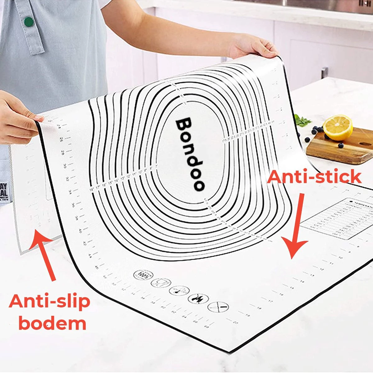 Gemaakt van duurzame, Foodgrade siliconen die steeds opnieuw kan worden gebruikt. De flexibele bakmat is voorzien van een antikleeflaag die zorgt voor moeiteloze voedselverwijdering. Gebruik de Bondoo Siliconenmatten bij het bakken van chocoladekoekjes, kaneelbroodjes, zelfgebakken brood of bij het maken van kleverige karamel of gebakken zalm met knoflook en citroen. Naast dat er geen etensresten aan de bakmat kleven beschikt deze zoals gezegd ook over een antislip werkoppervlak. Dit heeft als voordeel dat je het ook kan gebruiken als antislip werkoppervlak om deeg, marsepijn, fondant en andere Ingrediënten uit te rollen en te bewerken.