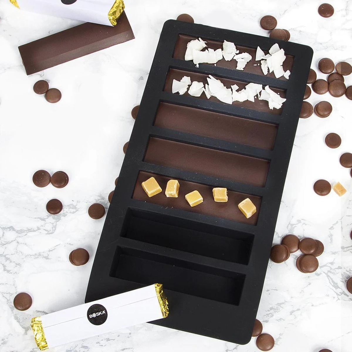 De mal is vaatwasserbestendig en kan ook gebruikt worden om rechthoekige ijsklontjes in te maken. Haal je eigen chocolade en verschillende vullingen uit de kast en ga aan de slag met deze Choco Reep DIY Set van BOSKA. Je krijgt er standaard 10 jaar garantie op, dus maak je nog jarenlang de heerlijkste repen.