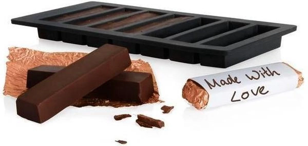 Volg de bijgeleverde recepten of bedenk zelf eindeloos veel combinaties. Verpak de repen in gepersonaliseerde wikkels. In de wikkel set zitten namelijk goudkleurige folies, papier en stickers om je wikkel mee te sluiten. Zijn de chocoladerepen klaar? Verras je familie en vrienden er van mee. Wat zullen ze er van smullen! De siliconen mal is flexibel. Hierdoor druk je de chocoladereep er met groot gemak uit.