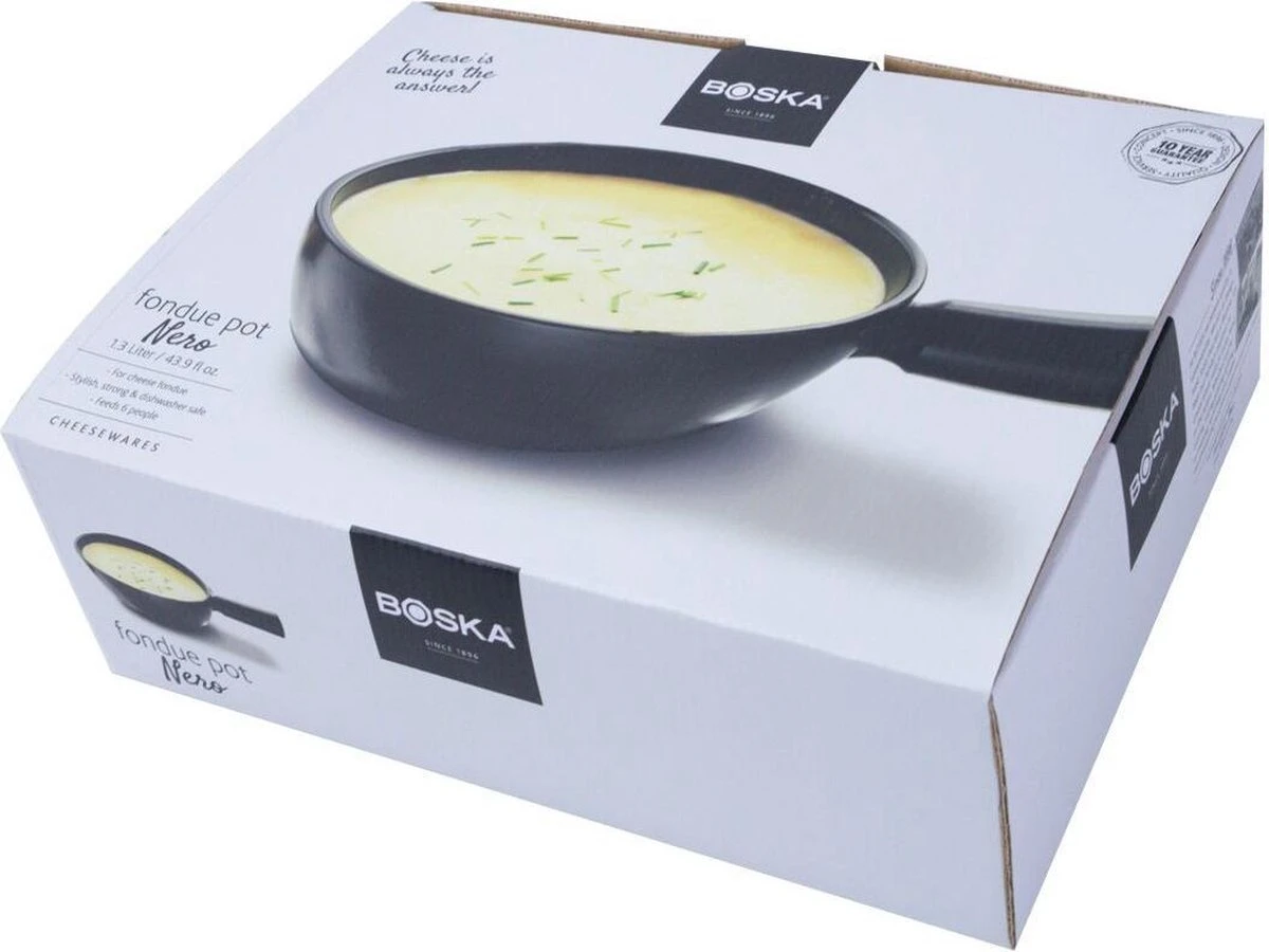 Met de Fonduepan Nero van BOSKA geniet je zorgeloos van de meest smaakvolle kaasfondue. Deze zwarte, keramieken pan heeft een inhoud van 1,3 liter; genoeg voor 875 gram gesmolten kaas. De pan is vuurvast en vaatwasserbestendig. Dat wordt genieten!
