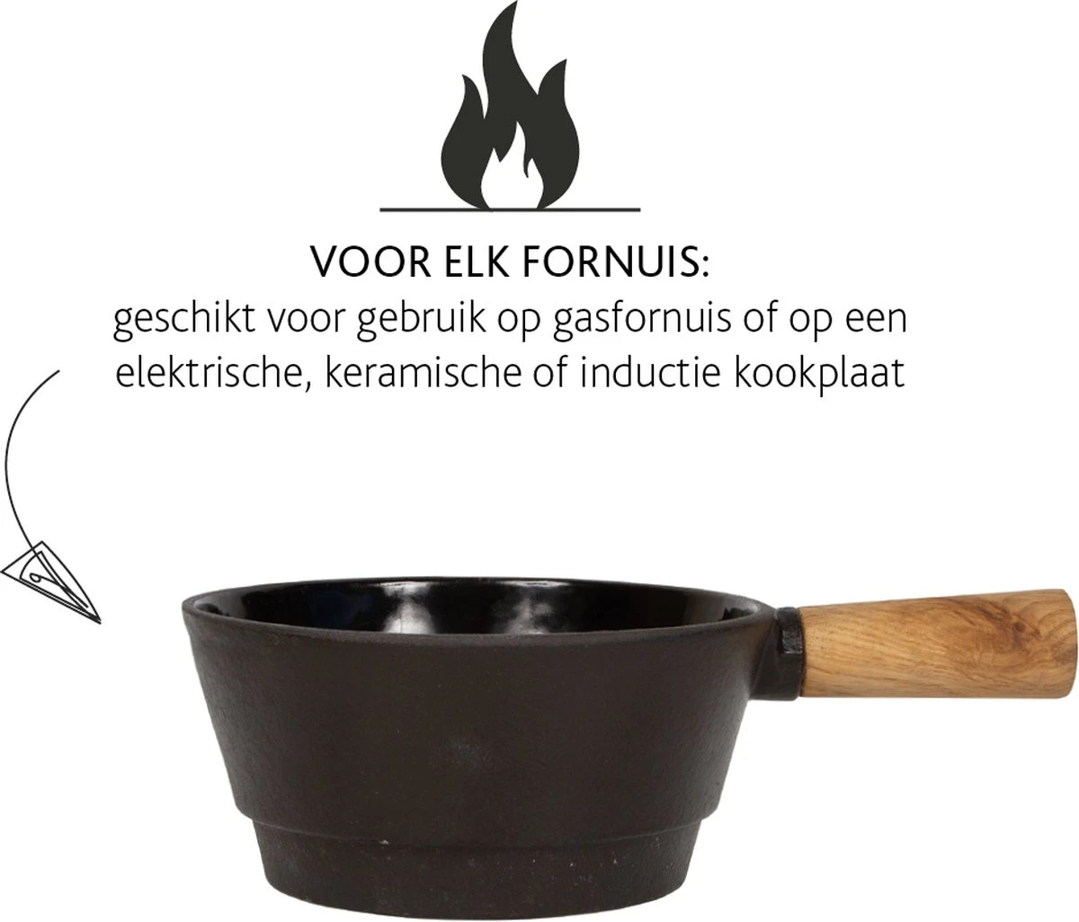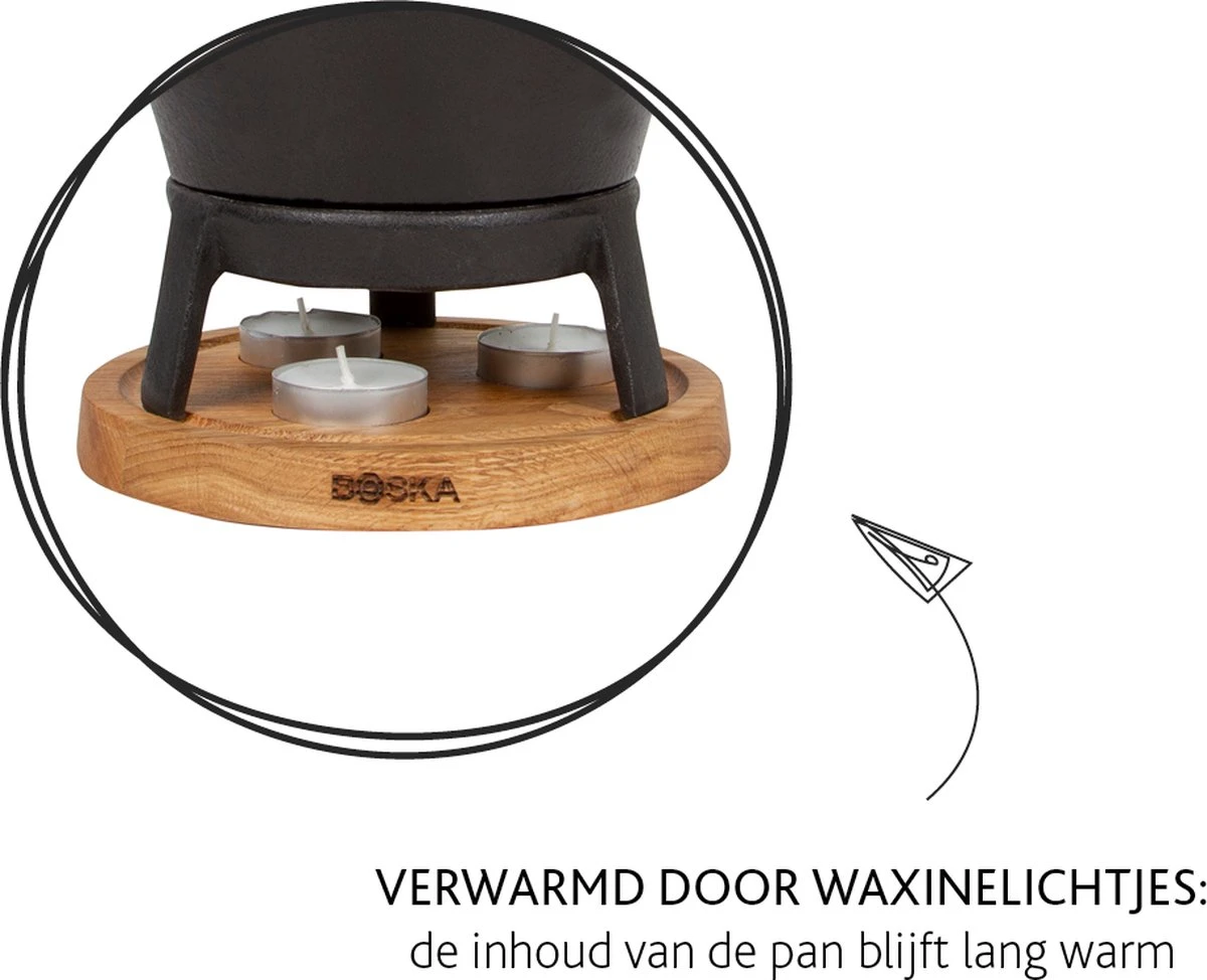 De gietijzeren fonduepan is geschikt voor gebruik op een keramisch, elektrisch, inductie of gasfornuis. Indien je alleen een andere hittebron hebt – zoals magnetron of oven – raden we je aan om een andere pan te gebruiken om de fondue warm te maken. Met een inhoud van 700 ml heb je ruimte voor 350 gram fonduekaas en genoeg kaasfondue voor vier personen. Op het gietijzeren met eikenhouten onderstel blijft je kaas door de waxinelichtjes lang warm.
