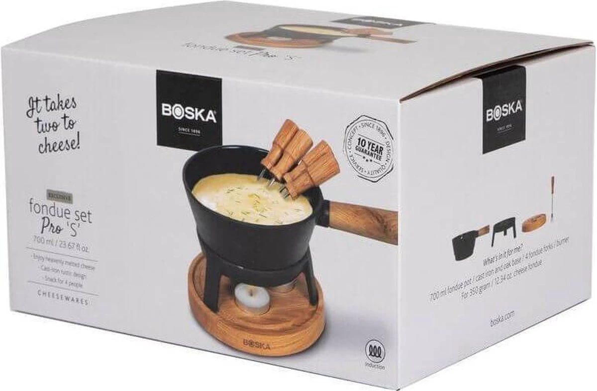 Met de BOSKA Fondueset Pro S heb je een fondueset die geschikt is voor elk type fornuis. De fonduepan is gemaakt van gietijzer en Europees eikenhout en heeft een inhoud van 700 ml. Naast de pan vind je nog waxinelichtjes, onderstel, 4 fonduevorken en recept in deze complete, robuuste set.