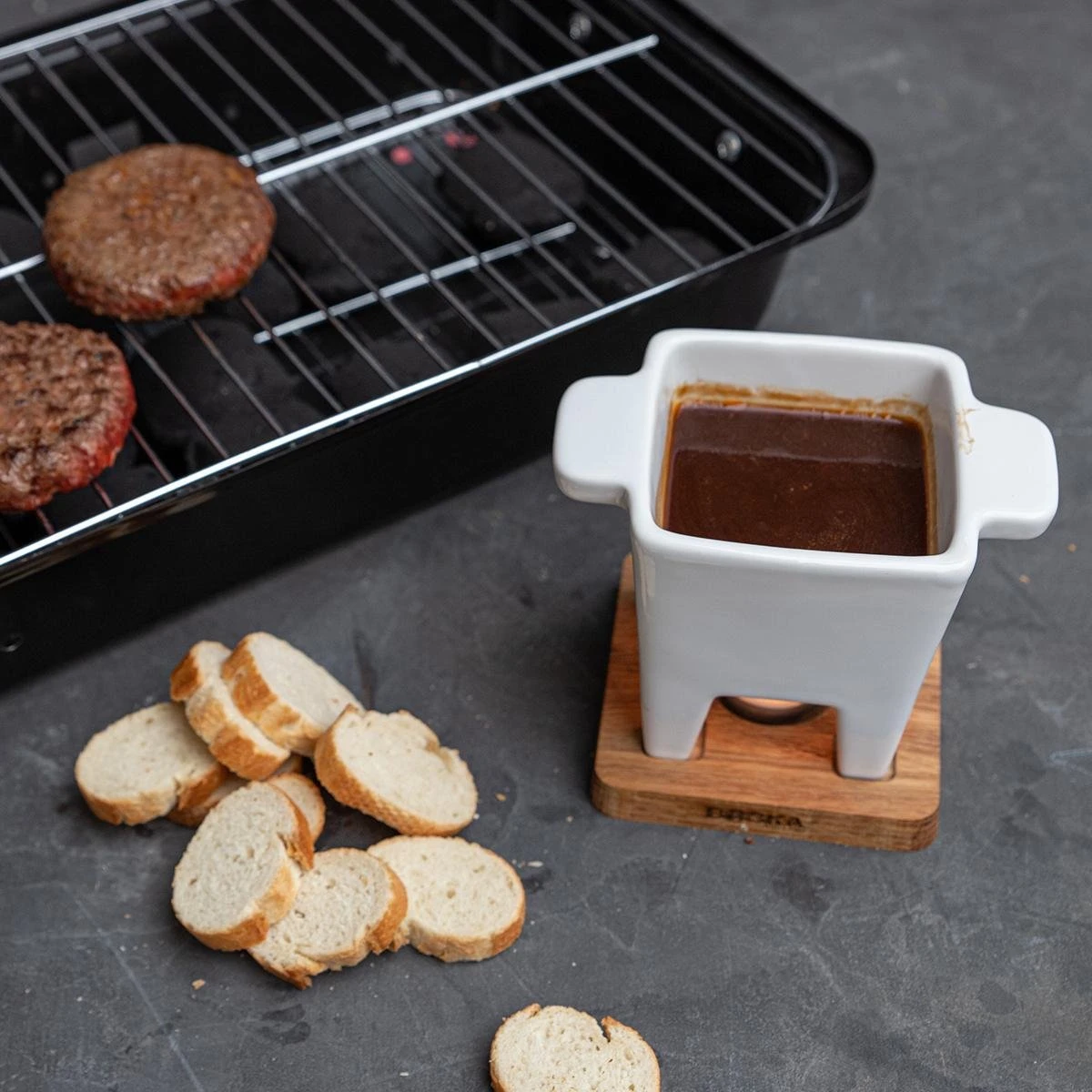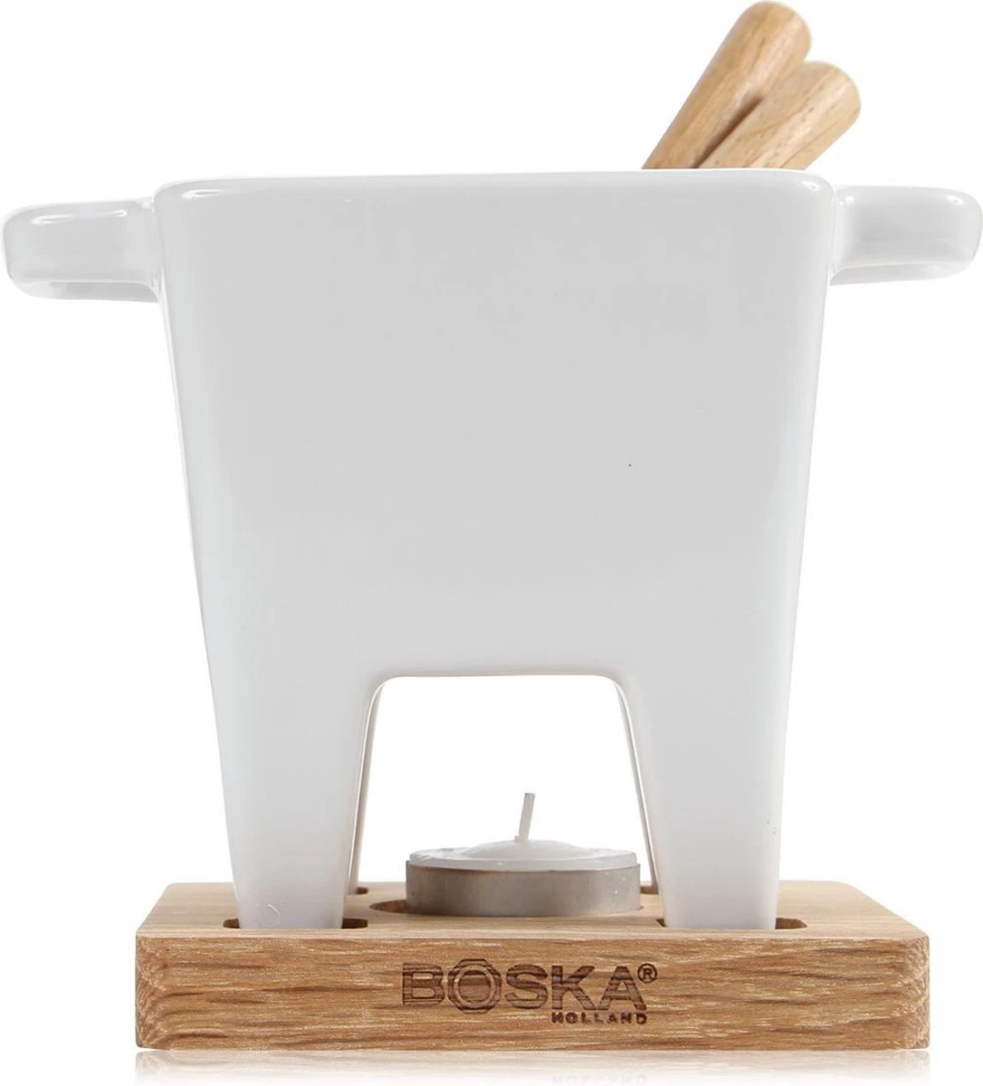 Deze complete set bevat een kleine, witte fonduepan, twee fonduevorken en een eikenhouten onderstel. Wil je de kaas snel laten smelten? Dat heb je zo geregeld! Het fonduepannetje mag namelijk in de magnetron. Zet hem op het handige onderstel en het waxinelichtje houdt de gesmolten kaas voor je warm. Na gebruik kan het pannetje gewoon de vaatwasser in. Het onderstel maak je gemakkelijk met een doekje schoon.