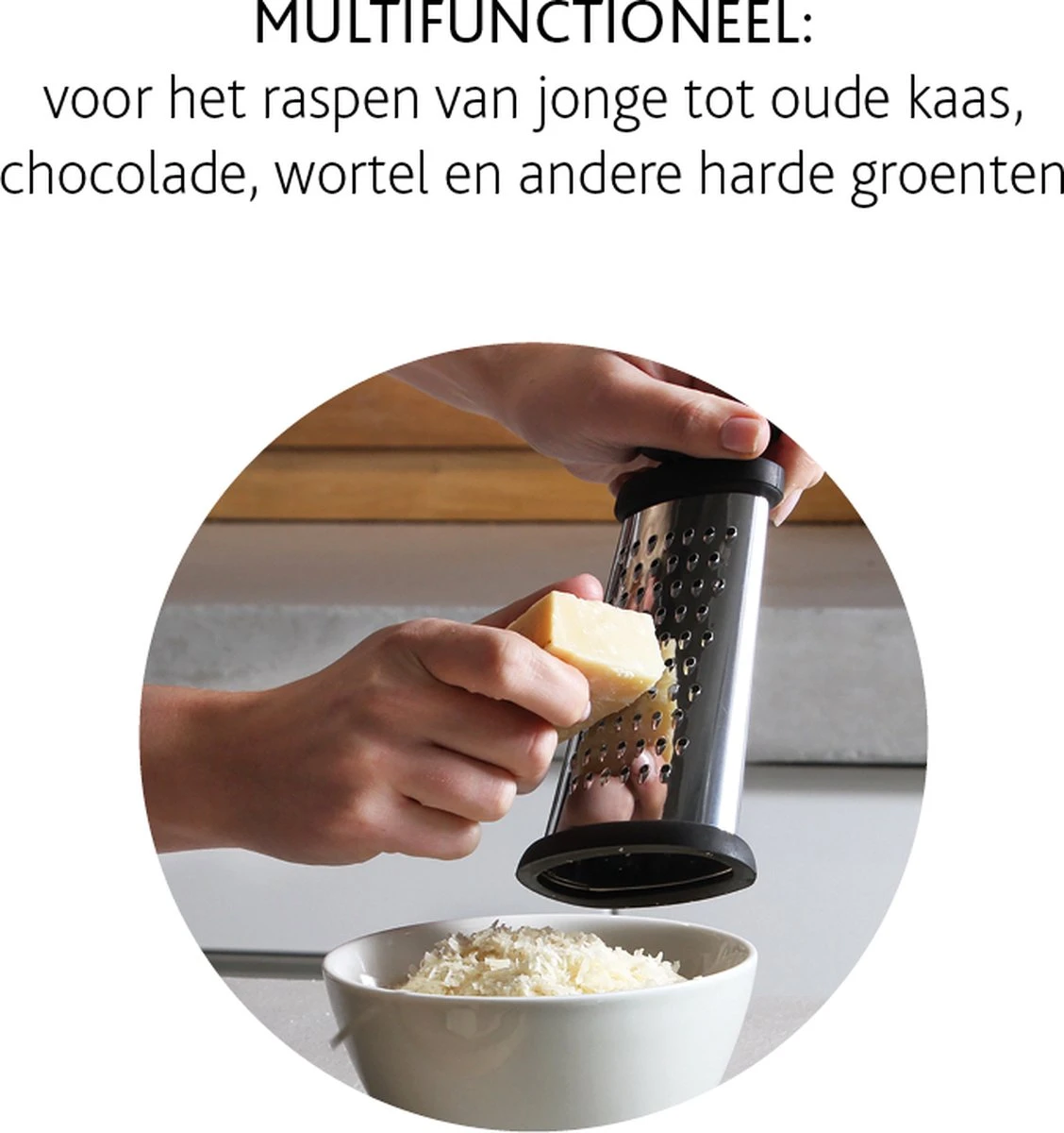 Met de Trio Formaggio van BOSKA rasp je je favoriete kazen op drie manieren: vlokken, grof en fijn. Heerlijk voor over je pizza, pasta of in de soep! Want zeg nou zelf: versgeraspte kaas is toch veel smaakvoller dan de voorverpakte variant?! Er is een reden dat versgeraspte kaas nog beter smaakt dan voorverpakte geraspte kaas. Tijdens het raspen komt namelijk zuurstof vrij. Dit zorgt dat de smaak van je kaas nog intenser is en maakt deze handige kaasrasp onmisbaar in je keuken. Naast kaas kun je ook chocolade, komkommer en bijvoorbeeld citrusvruchten met deze keukentool raspen. De rasp is zeer eenvoudig in gebruik. Zet hem op tafel, of hou hem boven je bord, en haal de kaas langs de rasp.