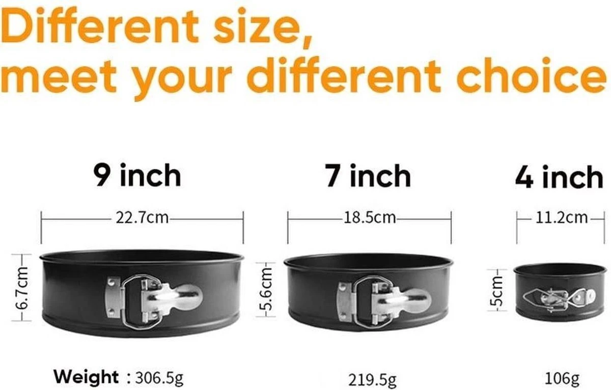 Cakevorm set bestaat uit: 3 stuks / set 4 inch, 7 inch en 9 inch non-stick springvorm voor het bakken. Kan worden gebruikt om mooie drie-tier taarten te maken voor gelegenheden zoals verjaardag, feest, bruiloft, enz. Ideaal voor het maken van diverse taarten zoals cheesecake, mousse cake, chiffon cake, heerlijk eten, etc.
