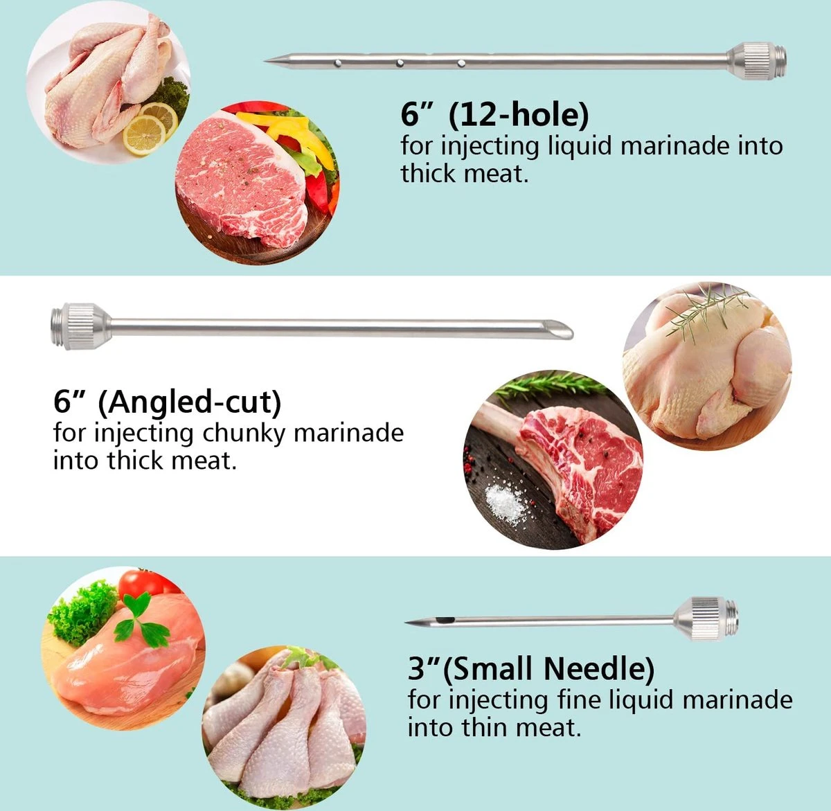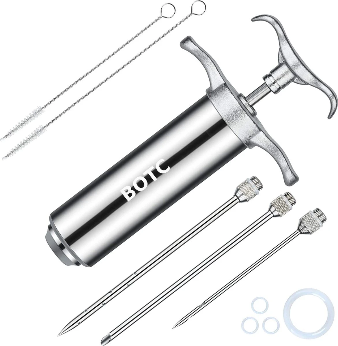SAFE KITCHEN/BBQ TOOL = 100% VEILIG & GEZOND: 304 roestvrij staal voor vleesinjector/ringen/vleesnaalden; siliconen voor o-ring afdichtingen; 100% voedselkwaliteit voor marinade/voedselingrediënt contactdelen om uw familie veilig en gezond te houden.