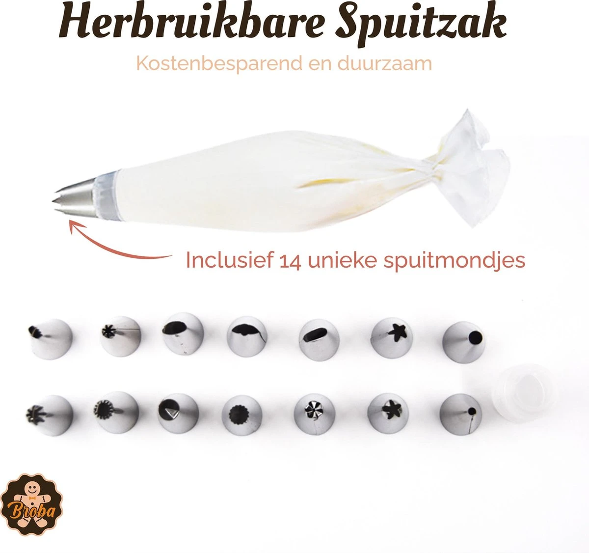 Een mooie afwerking van jouw baksel is als de puntjes op de i, als een heerlijk vers gebakje na een lange wandeling, als de kers (of spuitmondjesvorm) op de taart! Wil je de taart perfectioneren? Dat kan! Bevestig één van de spuitmondjes die je nodig hebt en breng mooie figuurtjes aan op je taart. Wist je dat je een spuitzak ook kan gebruiken om gebakjes te vullen? Vul de zak met pudding, jam of gesmolten chocolade en spuit je zelfgemaakte gebakjes lekker vol. Hmm, heerlijk toch?