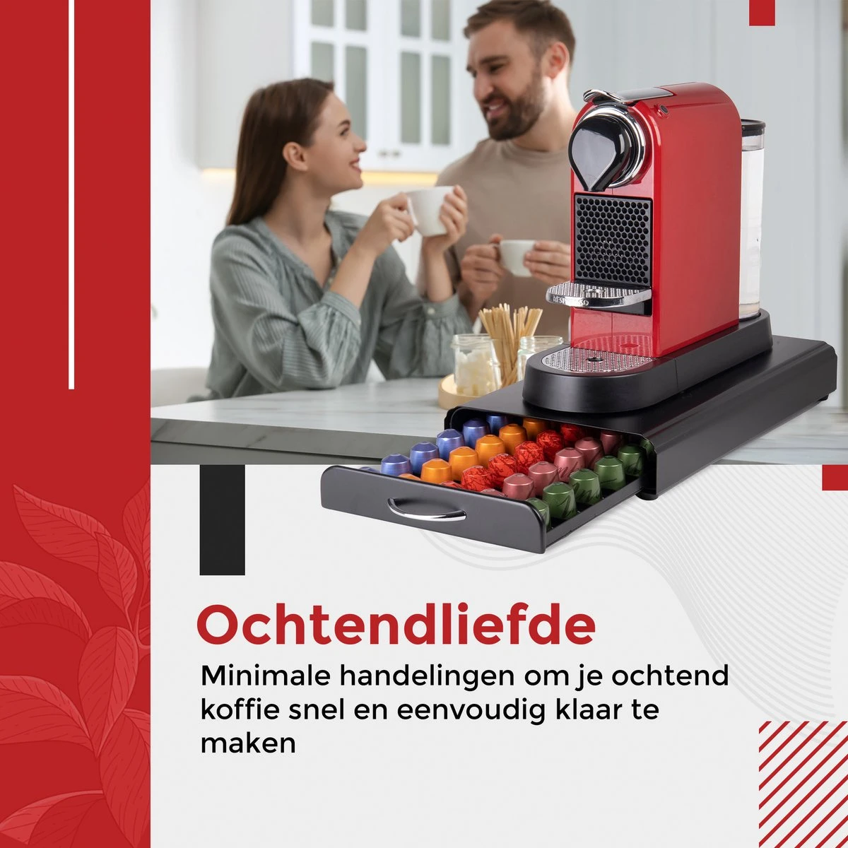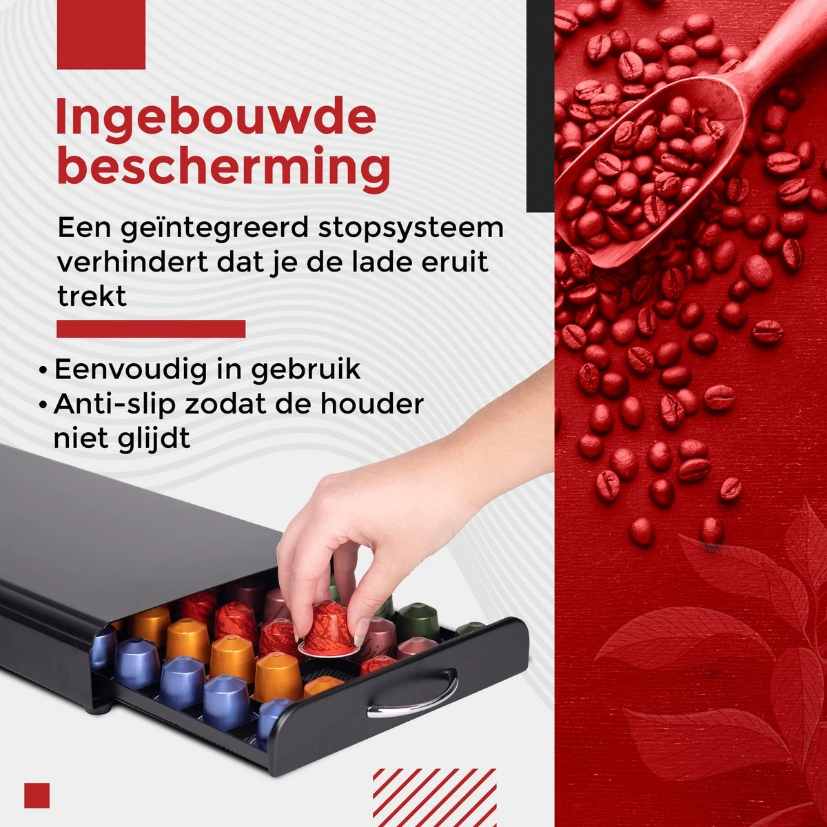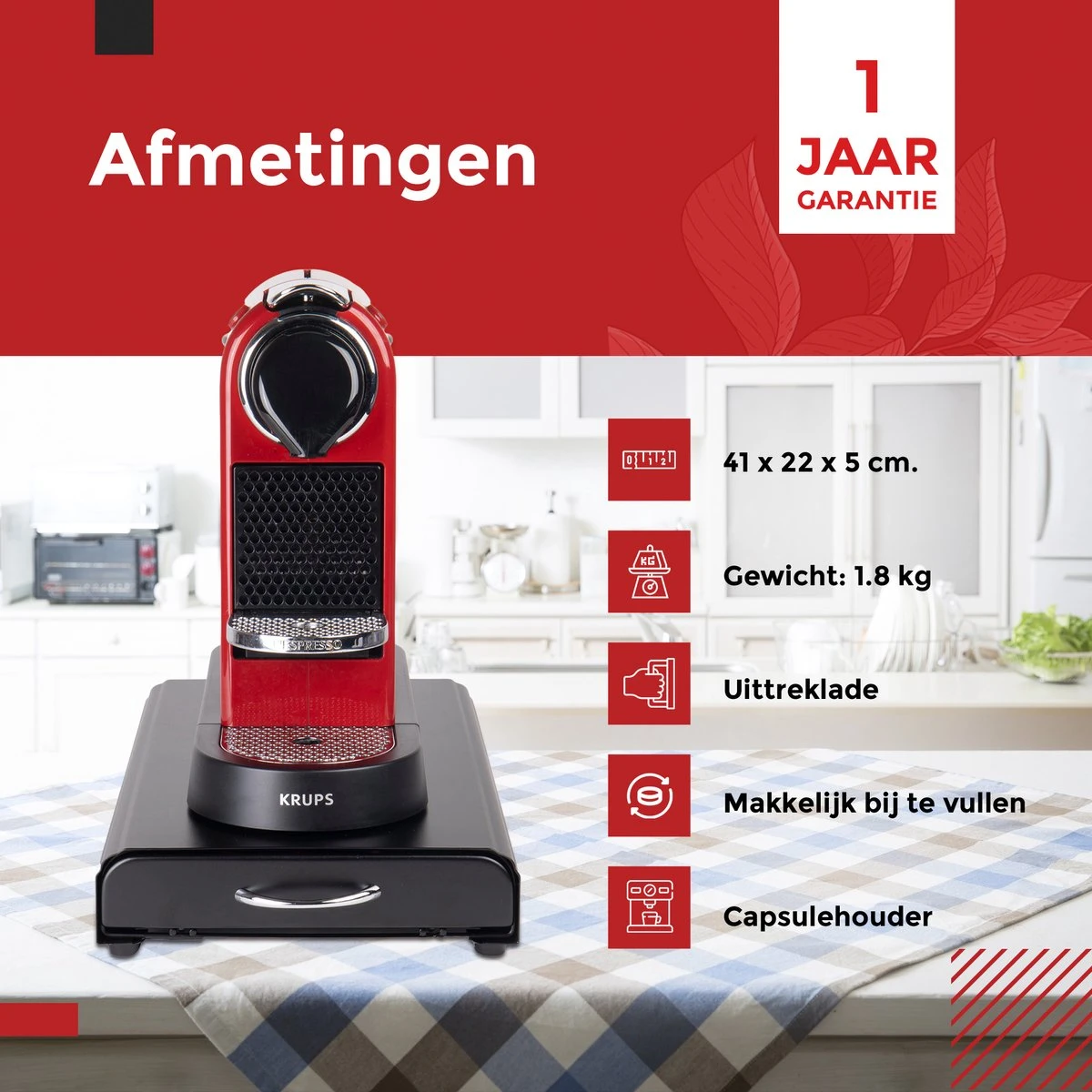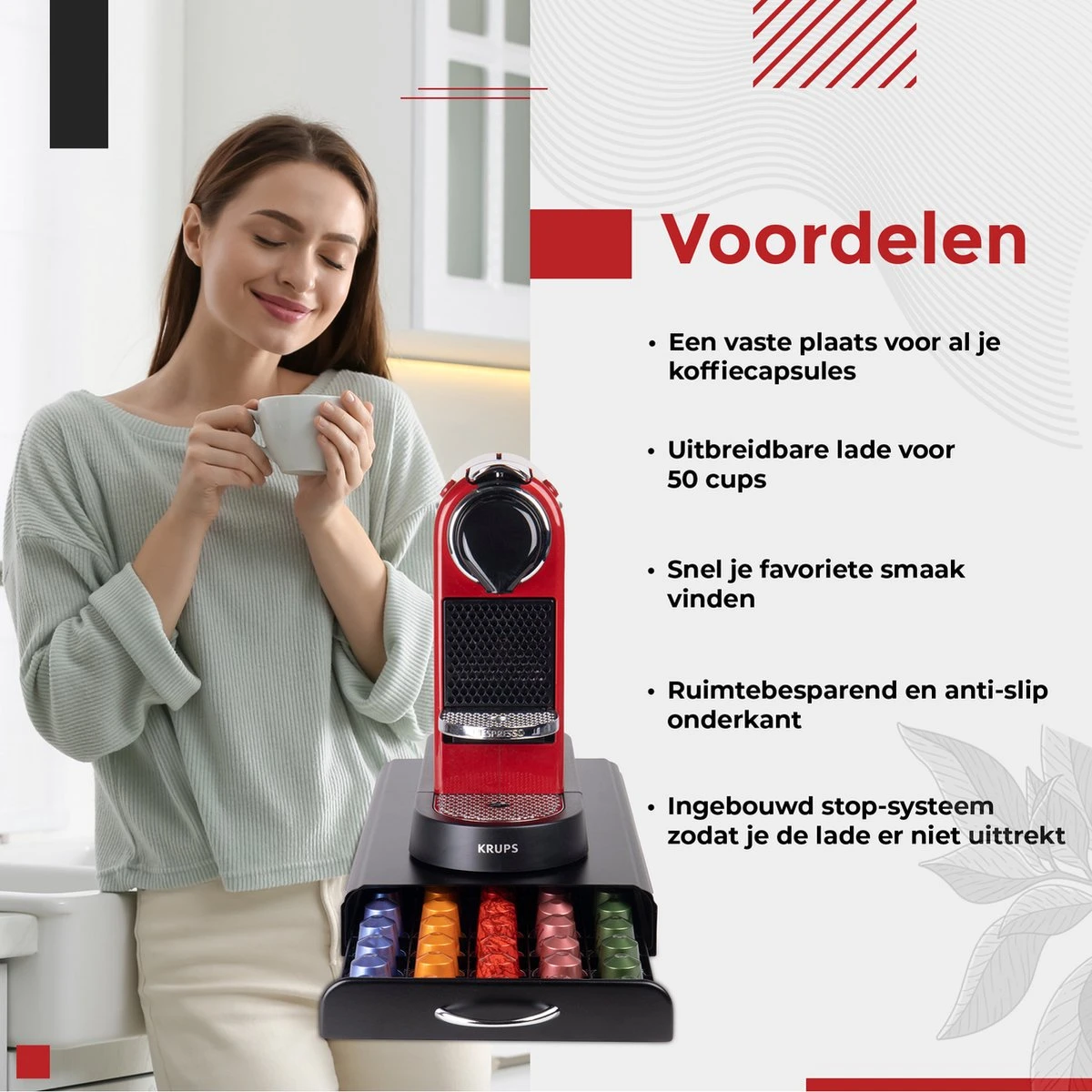 De lade bied ruimte tot wel 50 cups. De houder is opgedeeld in 5 rijen van 10 stuks, de houder werkt als uitschuifbare lade die gemakkelijk open dicht gaat, het is zo ontworpen dat je het koffiezetapparaat er bovenop kunt plaatsen om ruimte te besparen. zo heb je al je cups netjes binnen handbereik opgeborgen en neemt het weinig ruimte in beslag.