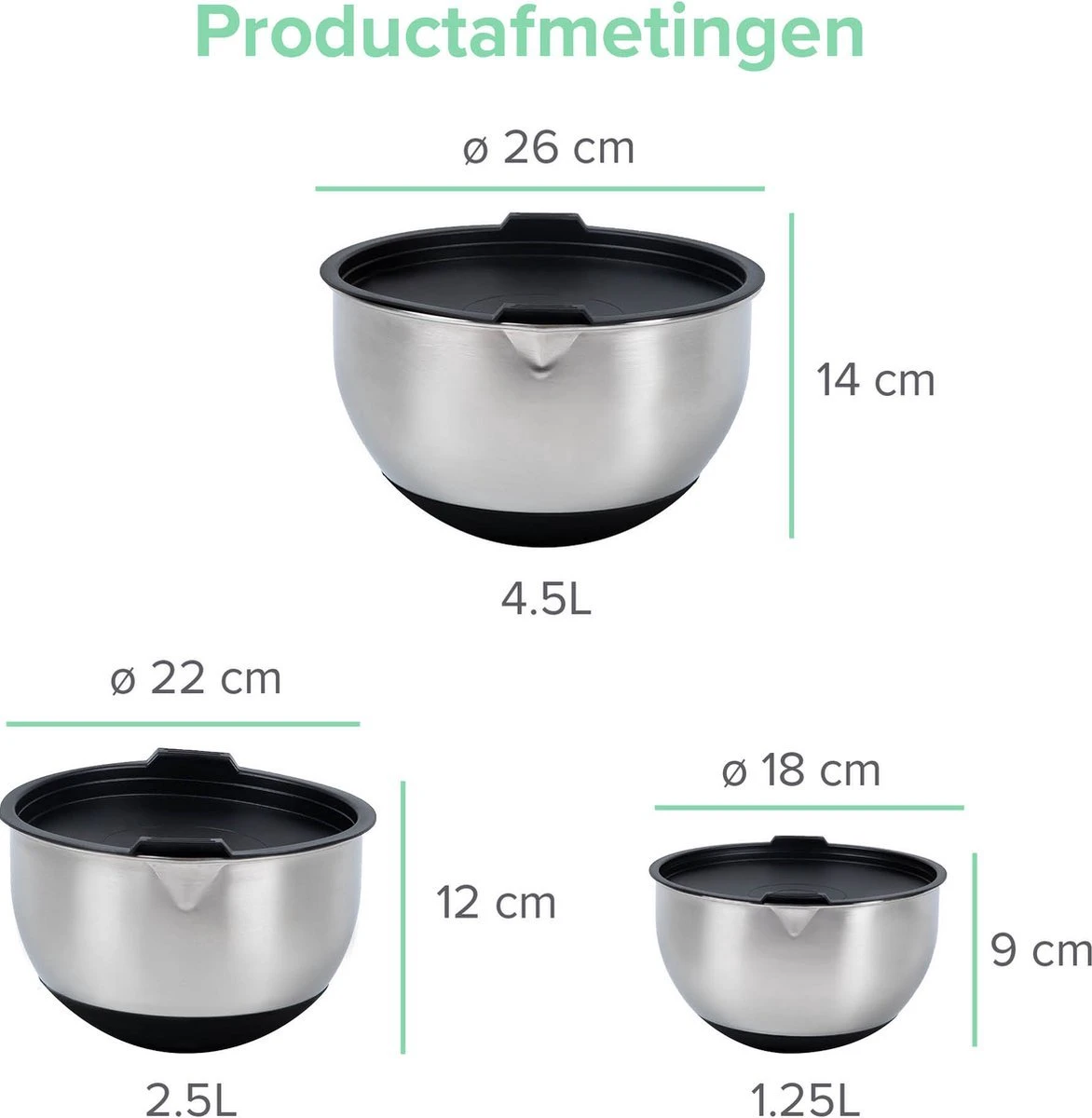 Tijd voor nieuwe mengkommen of op zoek naar beslagkommen die niet verschuift of wegglijdt tijdens het mengen? Deze 3-delige set van rvs-mengkommen is de meest ideale oplossing voor het mengen van ingrediënten. De handige beslagkommen komen met luchtdichte deksels, hiermee kunt u de beslagkom eenvoudig sluiten en worden de ingrediënten vers gehouden. De schenktuit maakt dat je gemakkelijk kan overgieten zonder de hele rand van de mengkom vies te hebben.