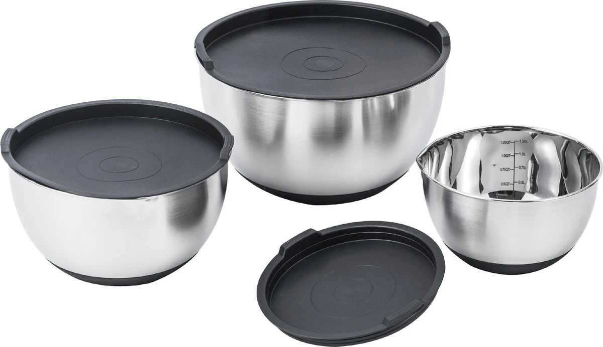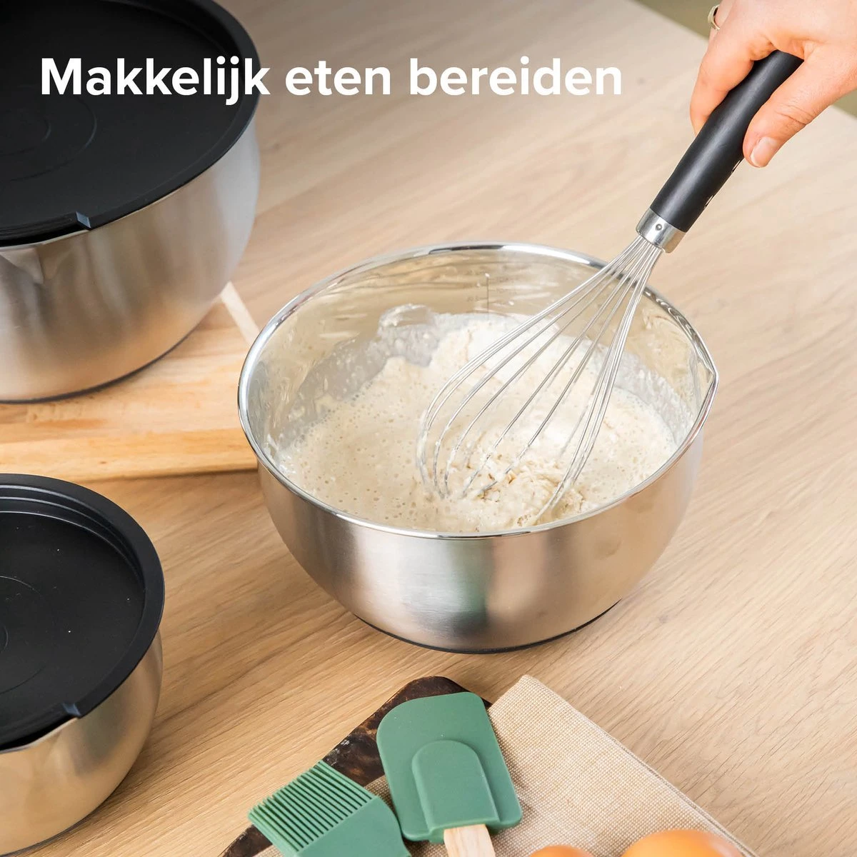 De meest ideale 3-delige set rvs-mengkommen met handige deksels, antislip en maataanduiding. Een musthave voor in elke keuken!