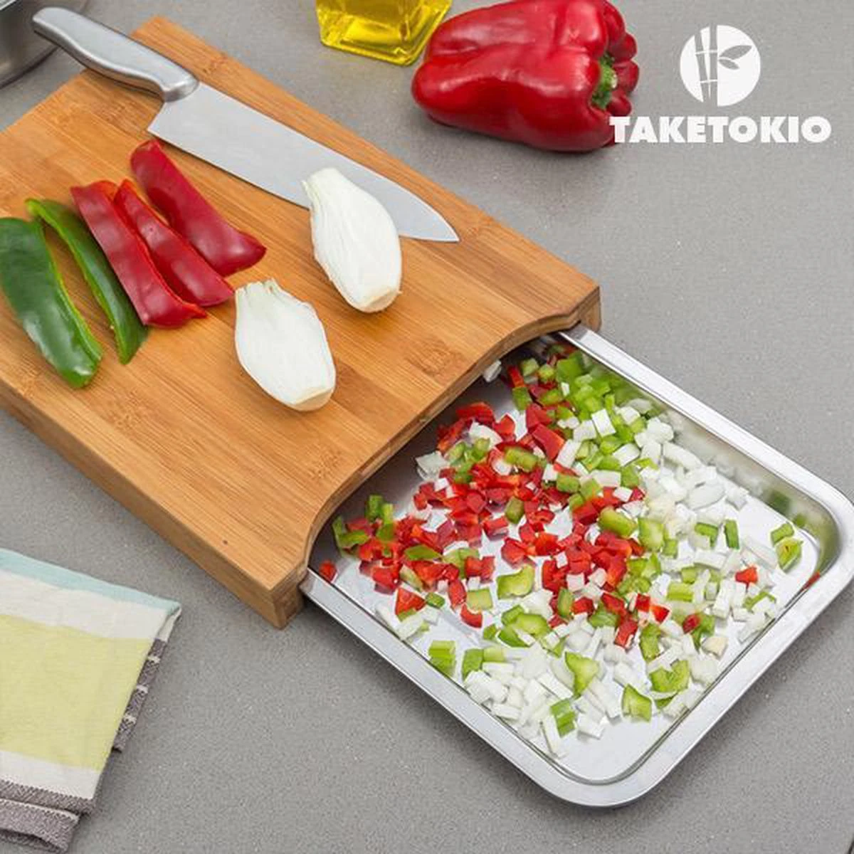 Handige bamboe snijplank met daaronder een RVS opvangbak van het merk Excellent Houseware. Groente snijden en direct in de luxe RVS opvangbak vegen (of juist het snijafval daar in opvangen).