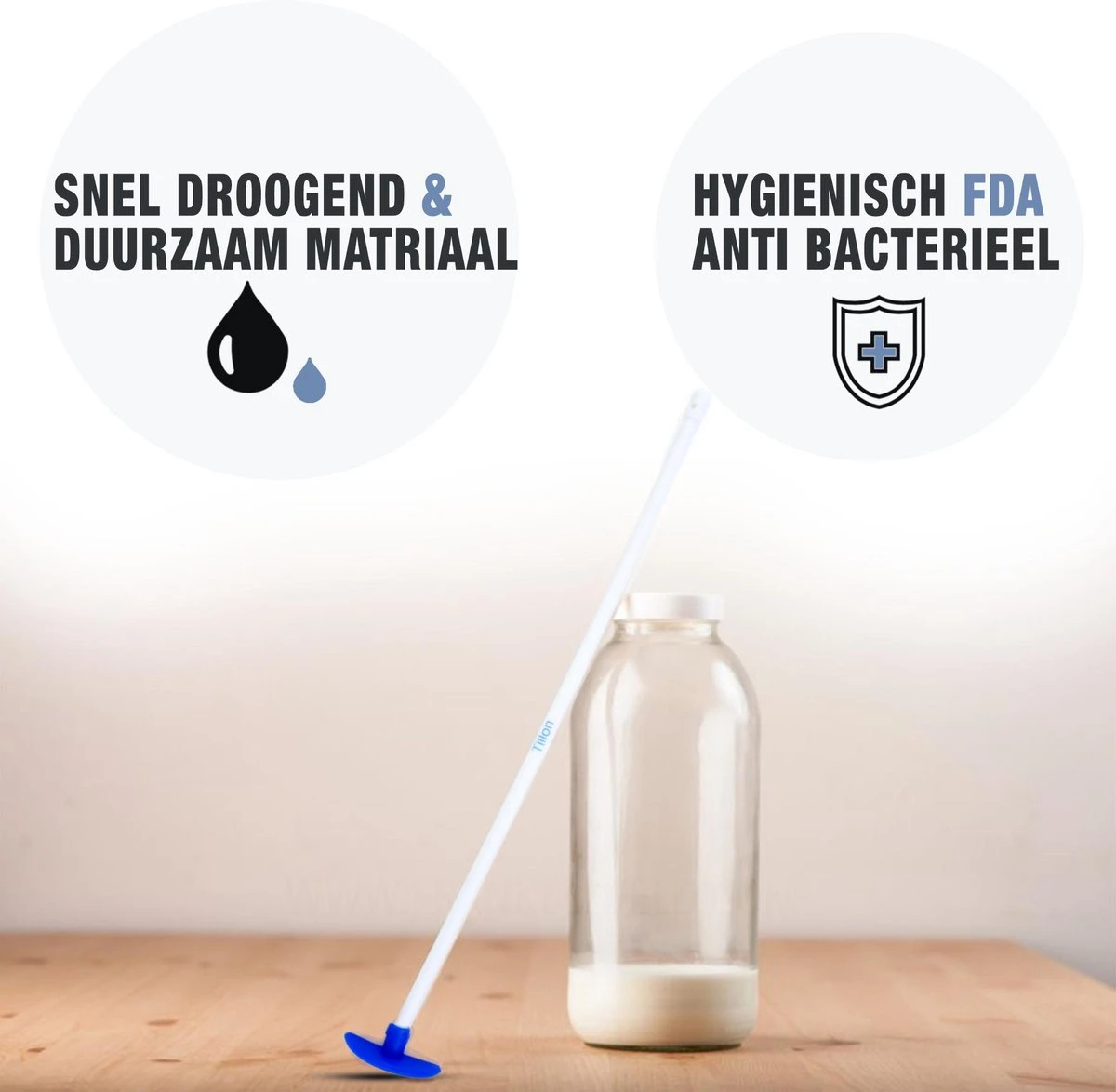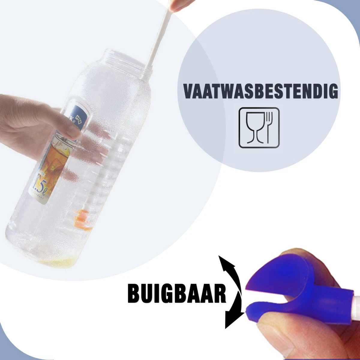 De handvaten zijn verstevigd zodat ze langdurige mee gaan en niet snel breken.Het ‘schrapertje’ is gemaakt van siliconen zodat het makkelijk mee beweegt in de bochten en is de flessenlikker voorzien van een ophang-oog wel zo handig!