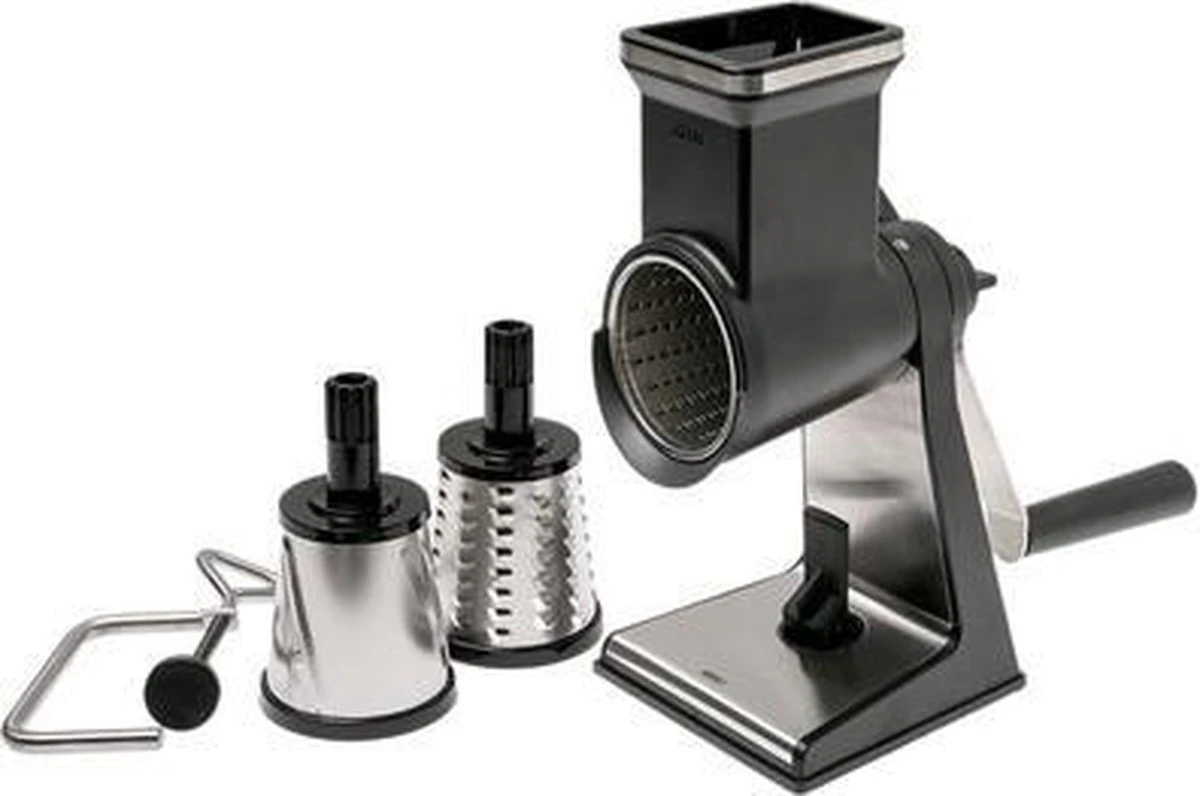 De multifunctionele trommelrasp wordt geleverd met drie extra scherpe trommels voor het verwerken van fruit, groente, kaas, kastanjes, chocolade en noten. De drie trommels zijn bedoeld voor fijne vlokken, ruwe raspels of dunne plakjes. De rasp heeft een hoog voetstuk zodat u hieronder eenvoudig een schaaltje kunt zetten.