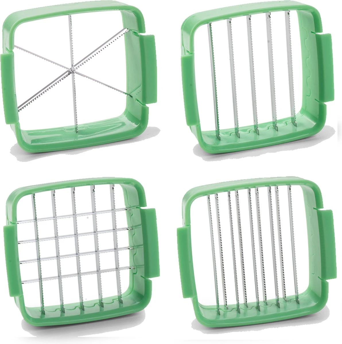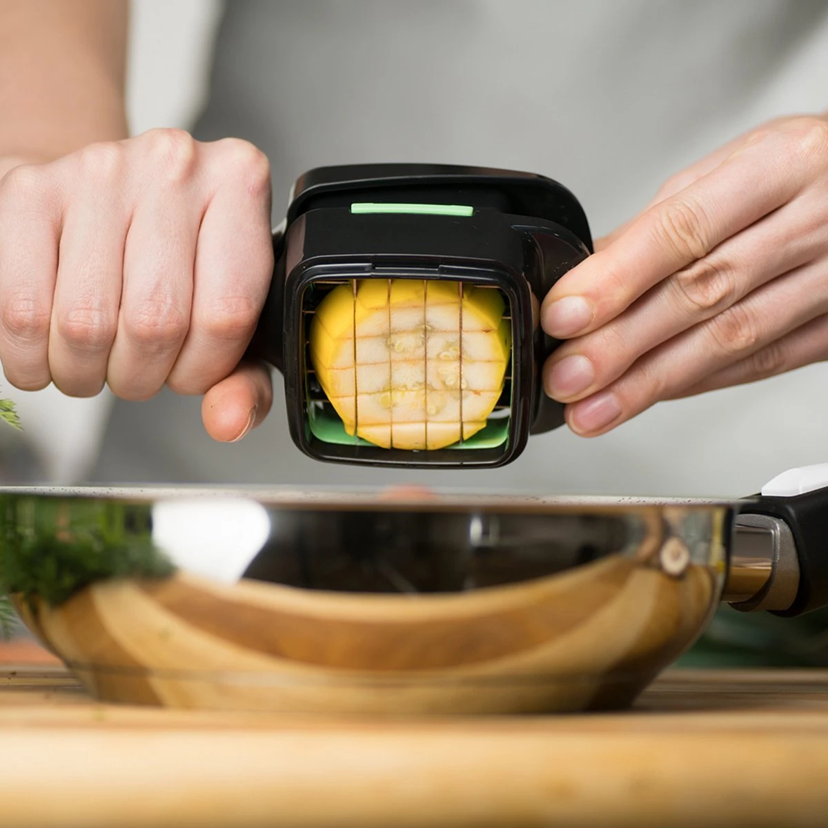 Leg het te snijden ingrediënt in het snijapparaat, druk aan en alles is perfect gesneden. Zowel harde als zachte levensmiddelen. De Nicer Dicer heeft 4 verschillende snij-opties waarmee groente, fruit en ei gesneden kan worden: