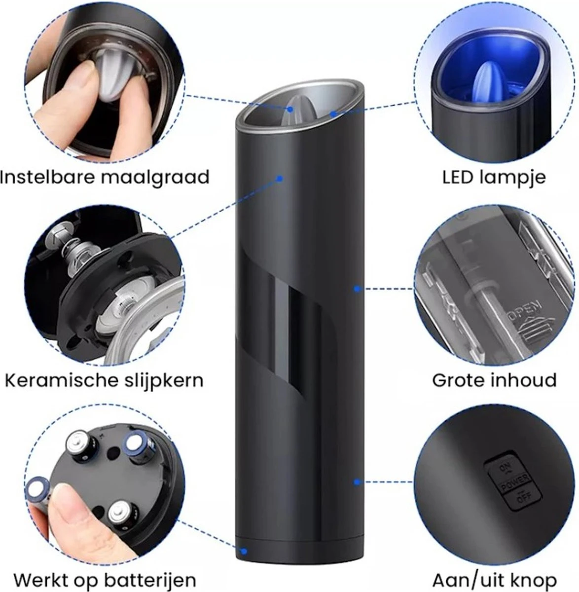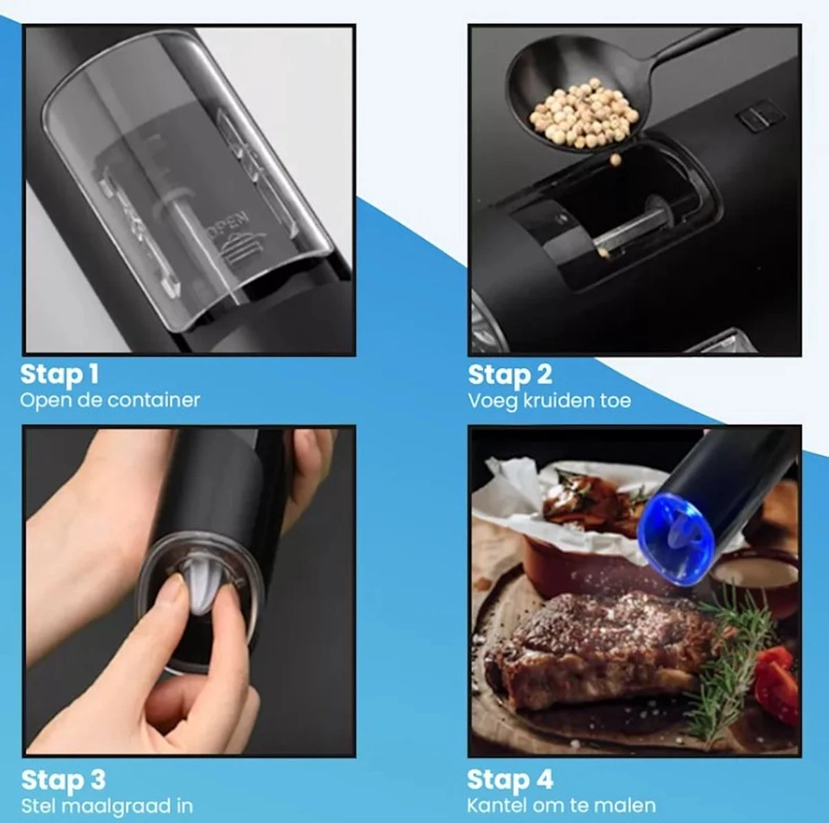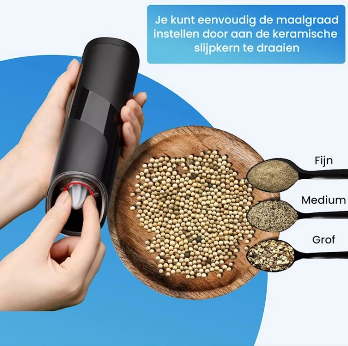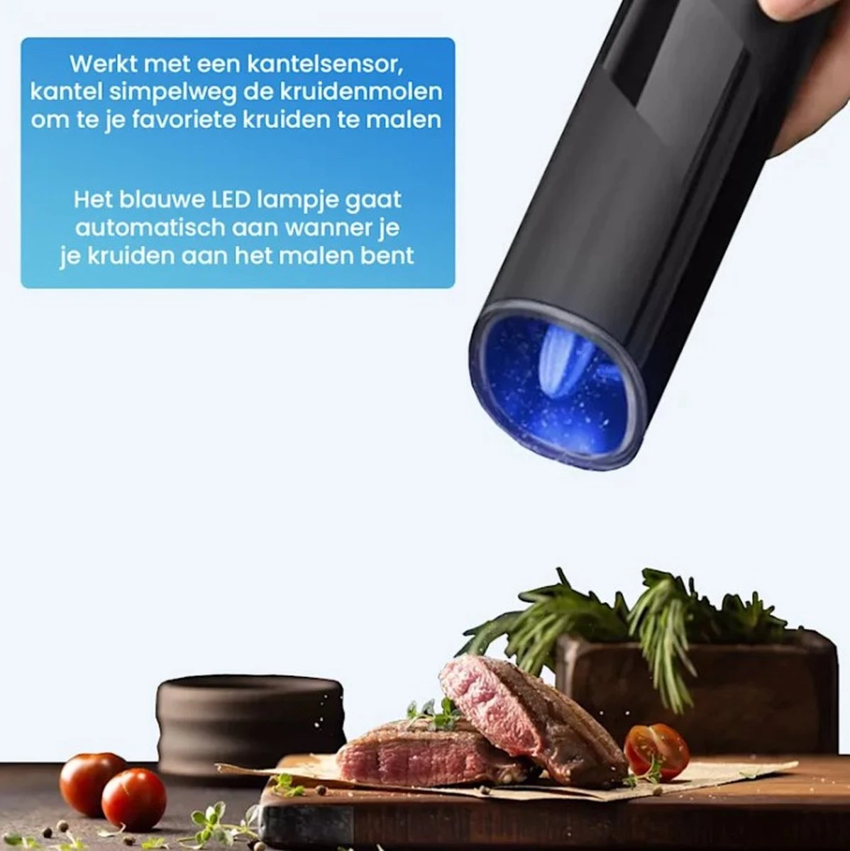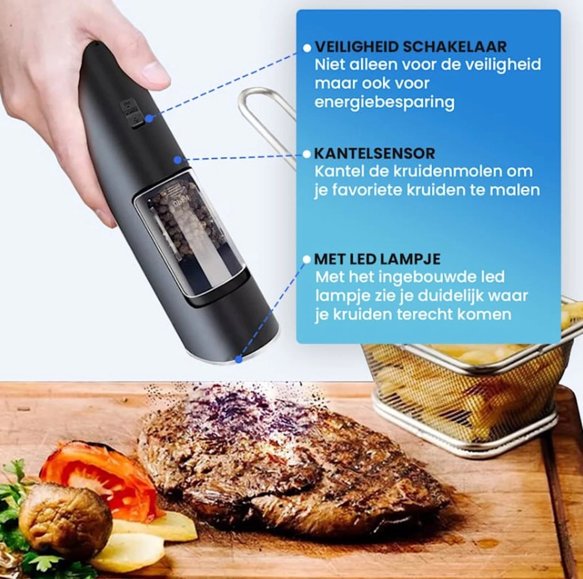 Voeg altijd de perfecte hoeveelheid kruiden toe aan jouw maaltijden zonder jouw handen vies te maken! De prachtige set is gemaakt van roestvrijstaal en is voorzien van LED-verlichting voor een luxe uitstraling in jouw keuken.