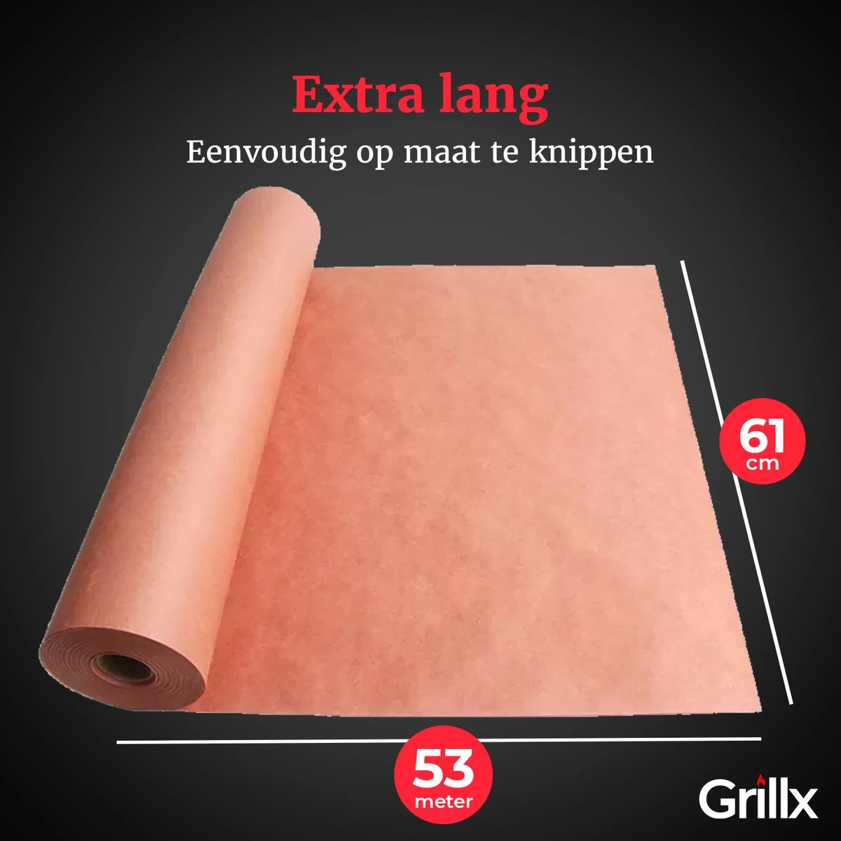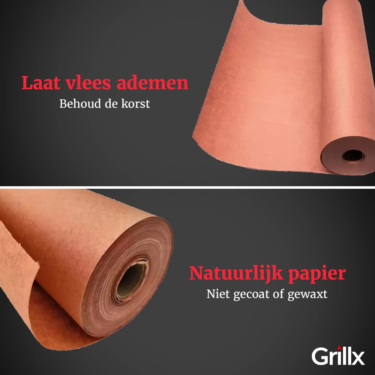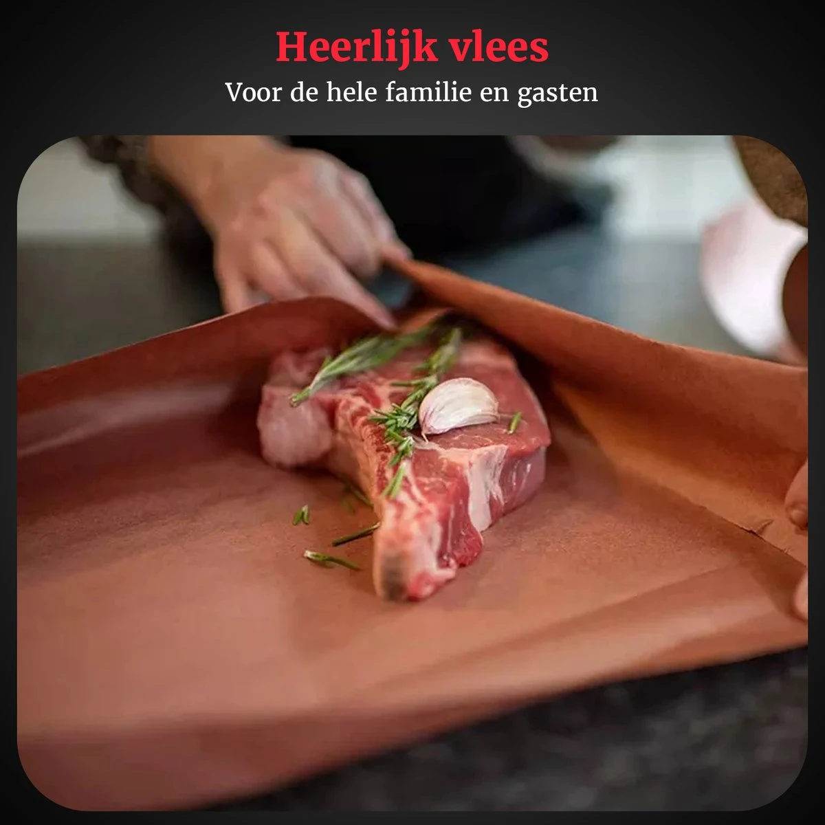 Slagerspapier, voor de echte barbecue-fanaat mag slagerspapier uiteraard niet ontbreken, het slagerspapier is versterkt bakpapier welk ook luchtdoorlatend is. Dit zorgt ervoor dat de stoom uit de ‘verpakking’ kan ontsnappen. Het voordeel van het ontsnappen van de stoom uit de verpakking is dat het vlees een stevig postuur krijgt.