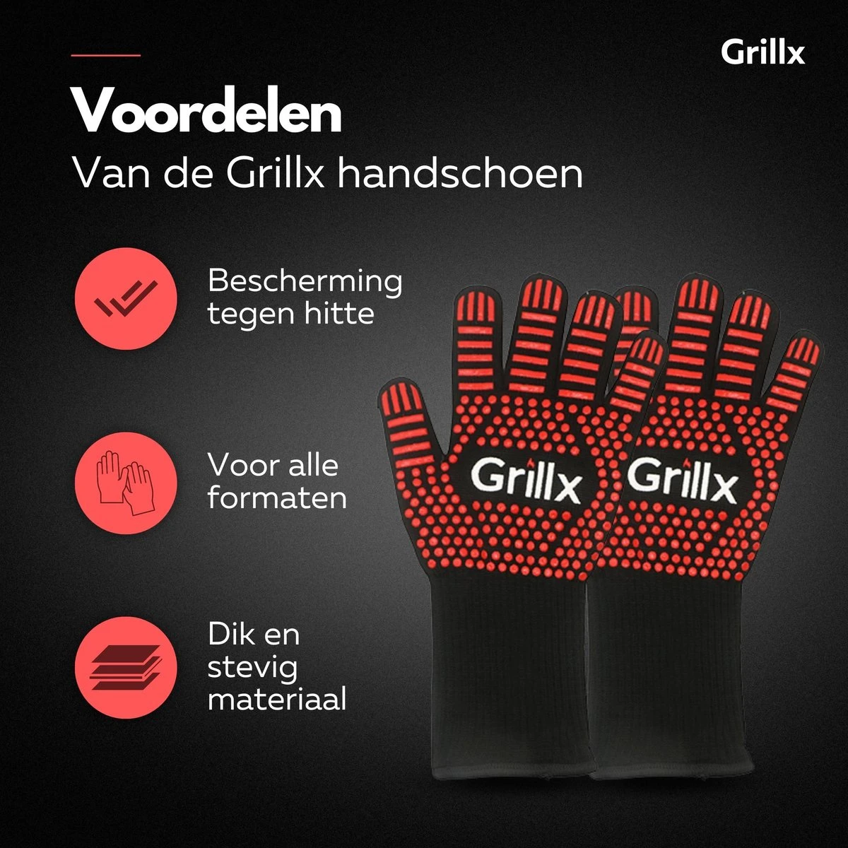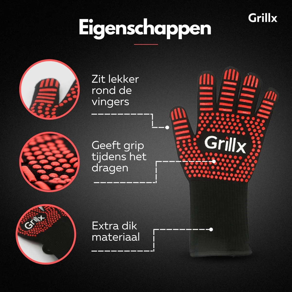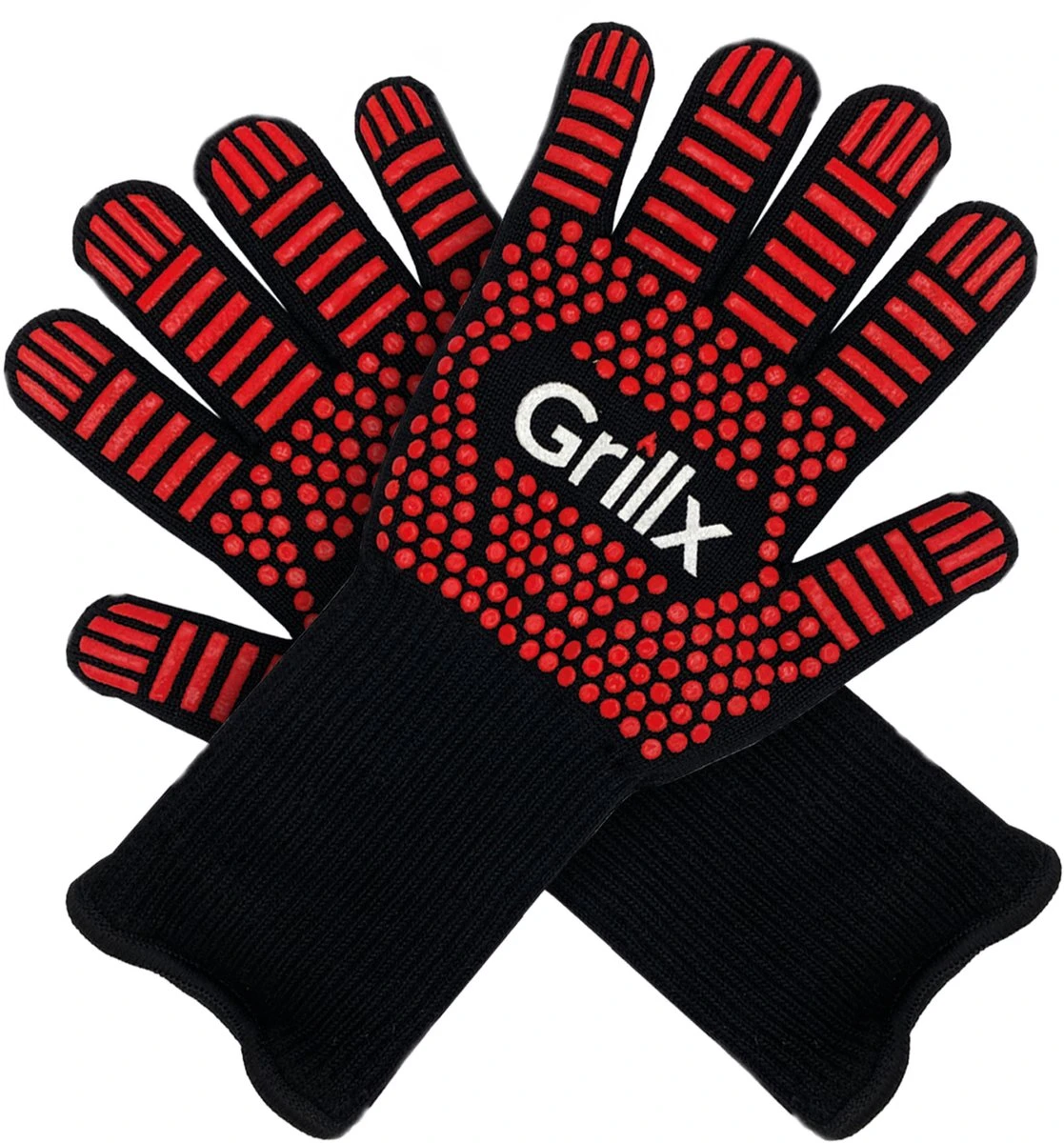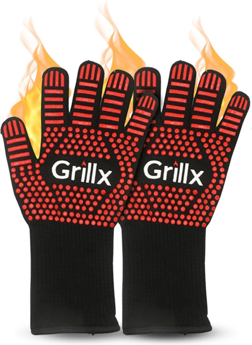 De hittebestendige handschoenen van GrillX bieden u een hoge mate van bescherming tegen hitte tot wel 500°C. Gemaakt van hittebestendige aramidevezels en voorzien van het EN407 certificaat, zorgen deze handschoenen ervoor dat uw handen veilig zijn tegen de hitte. De katoenen voering binnenin de handschoenen zorgt voor extra zachtheid en comfort.