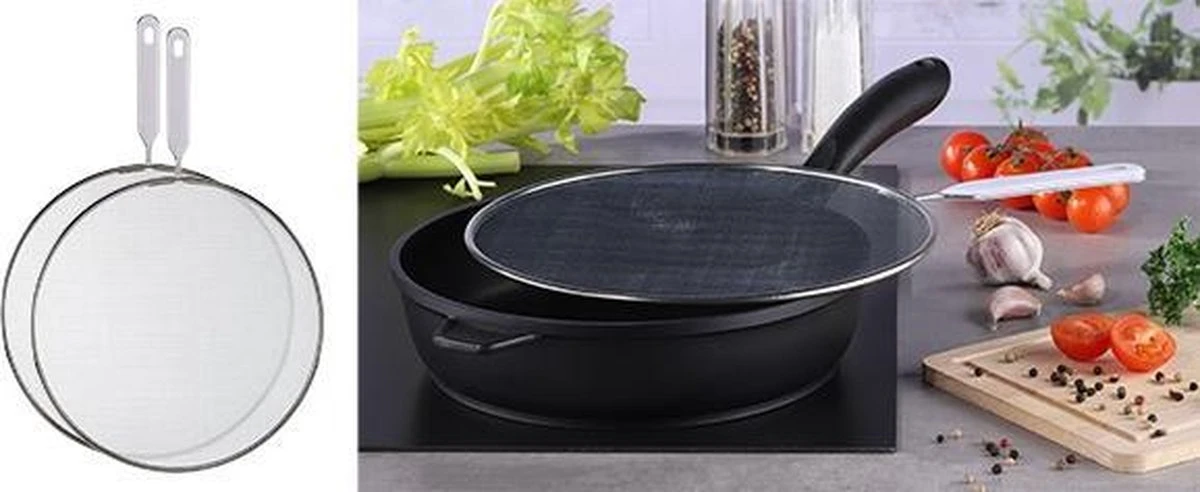 Nooit meer bakvlekjes op je kleding of het hele fornuis vies met vetvlekken danzij deze spatdeksels van Haushalt. Deze handige deksels leg je op de koekenpannen, de spetters blijven zo in de pan. De deksels ziijn gemaakt van roestvrijstaal de diameter zijn 25 en 29 cm.
