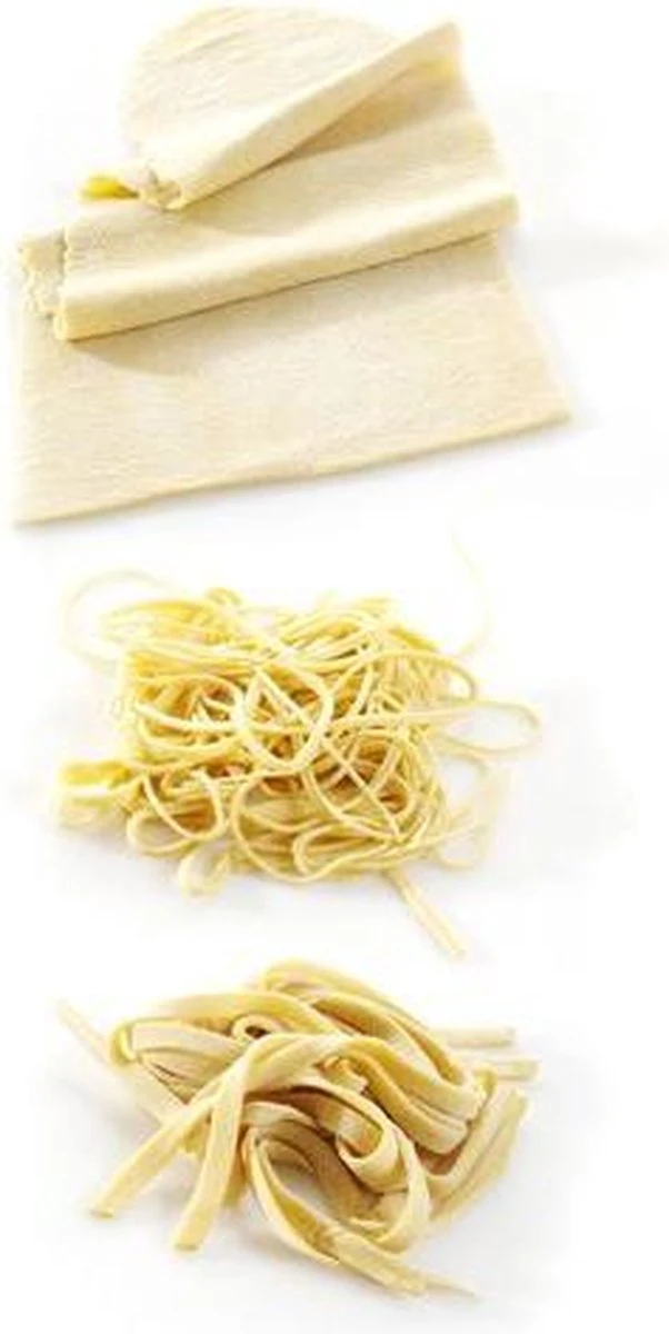 - Drie rollers/snijders: deegroller, tagliatelle snijder (6,25 mm) en fettuccine snijder (2 mm).