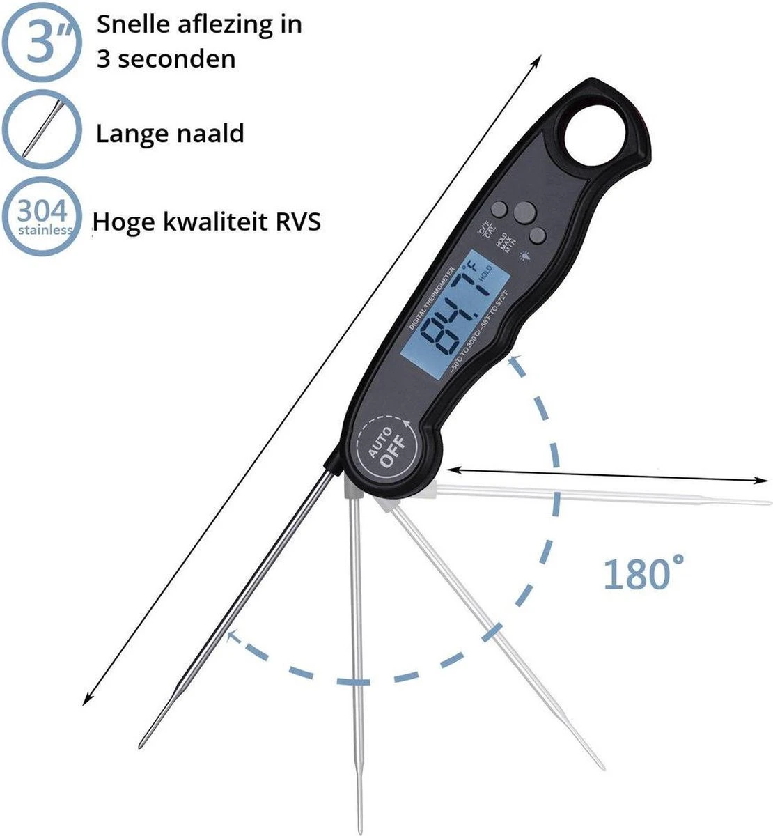 •Handige handgreep voor eenvoudig gebruik van de thermometer