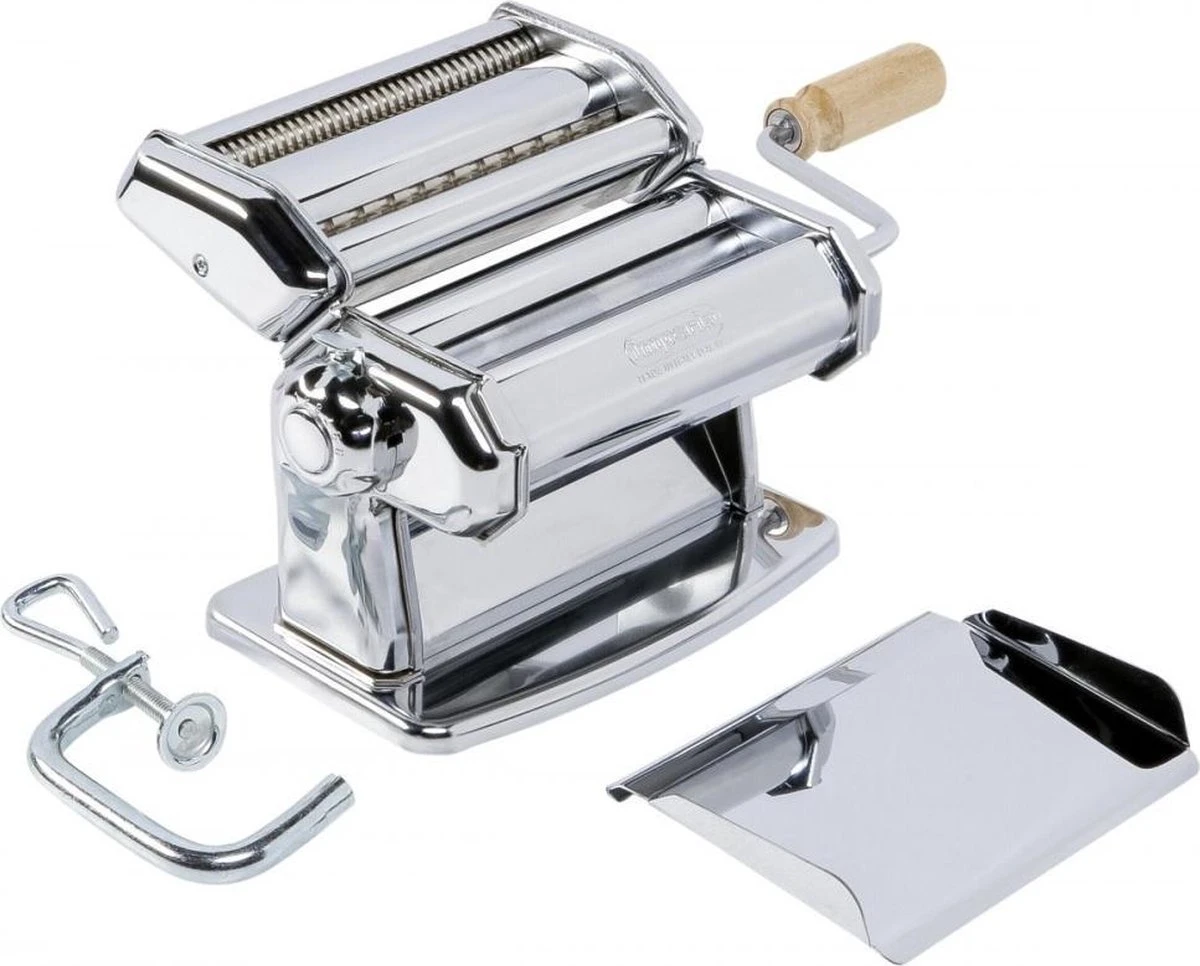 Er wordt slechts gebruik gemaakt van de beste materialen en deze worden zorgvuldig met de hand in elkaar gezet. In het apparaat zitten roestvrijstalen verstelbare rollers van 15 cm en 2 snijhulpstukken voor het maken van pasta in verschillende breedtes, zo maakt u in een hand omdraai de beste tagliatelle of fettuccine.