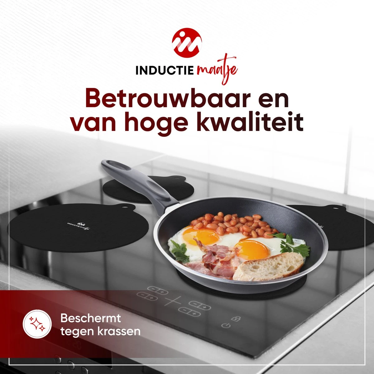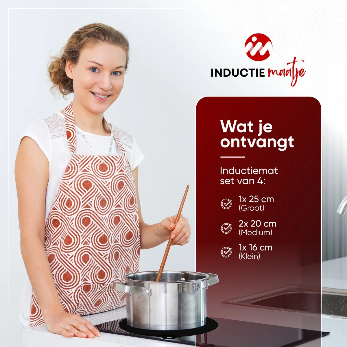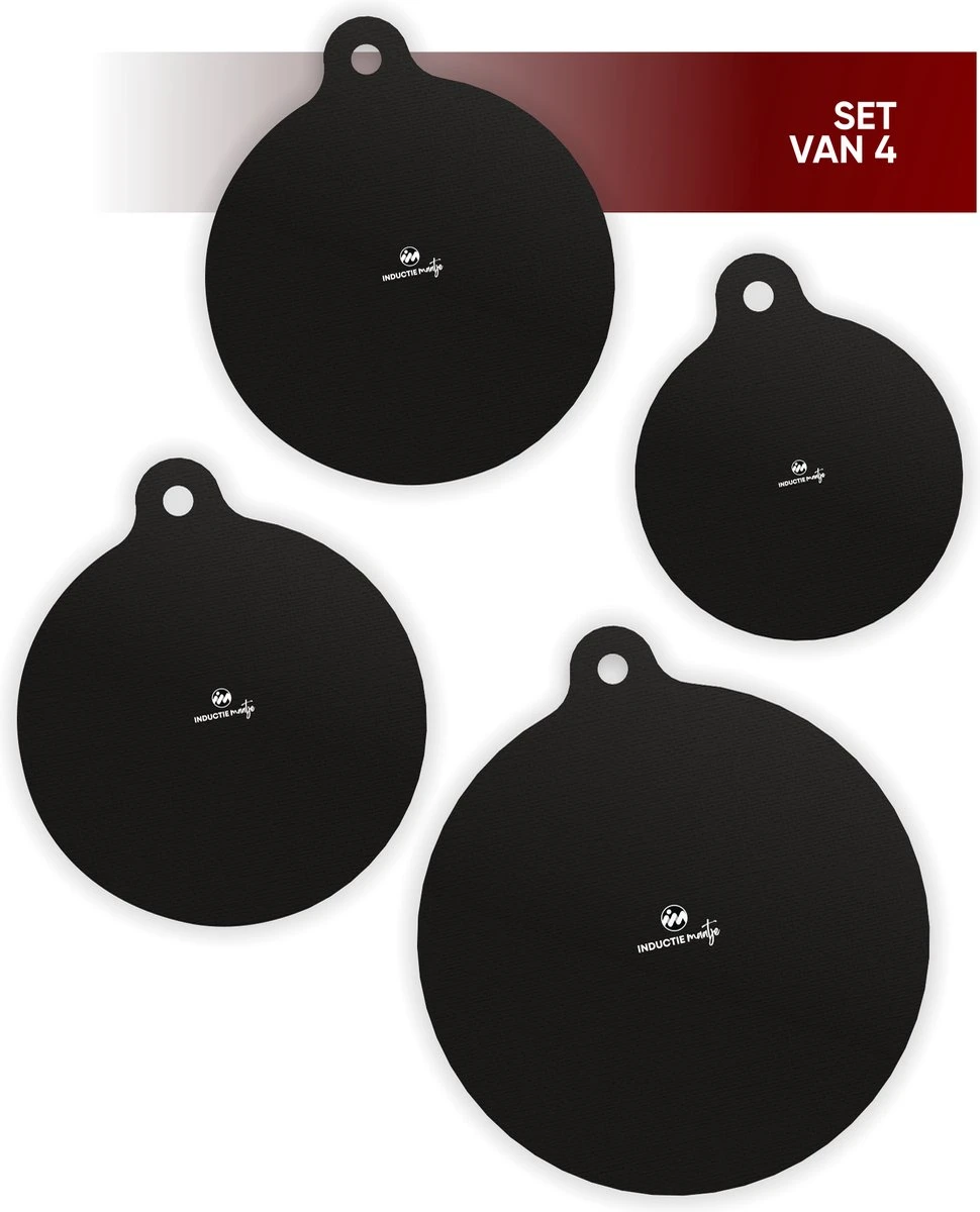 De Inductie Maatje Inductie Beschermer wordt geleverd in een set van 4. De matten zijn rond van formaat en hebben allemaal een verschillende diameter. Of je nou gebruik wilt maken van een grotere pan of de pan een andere vorm is, het maakt allemaal niet uit! Voor elke manier van koken heb jij de perfecte inductie mat.