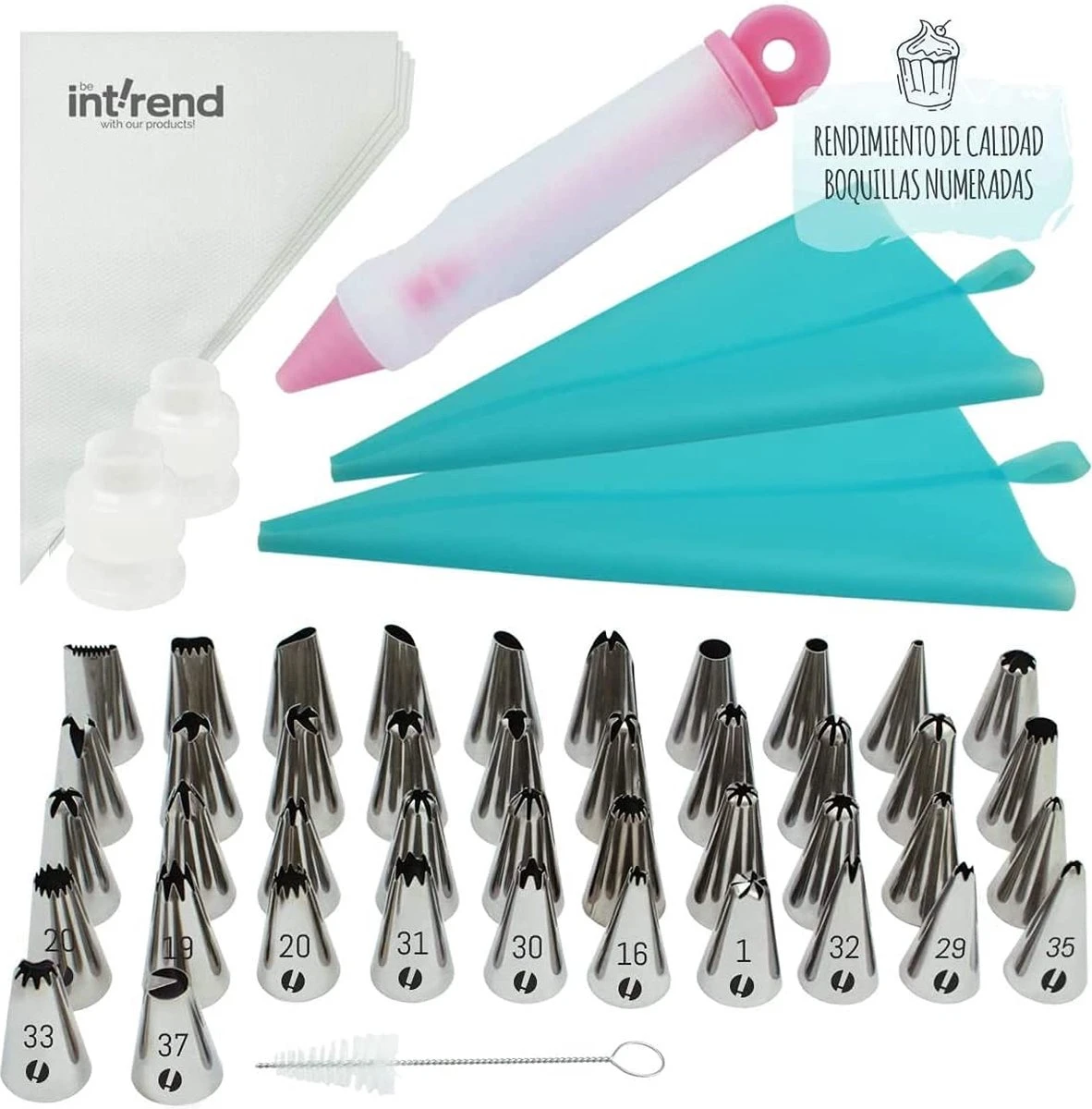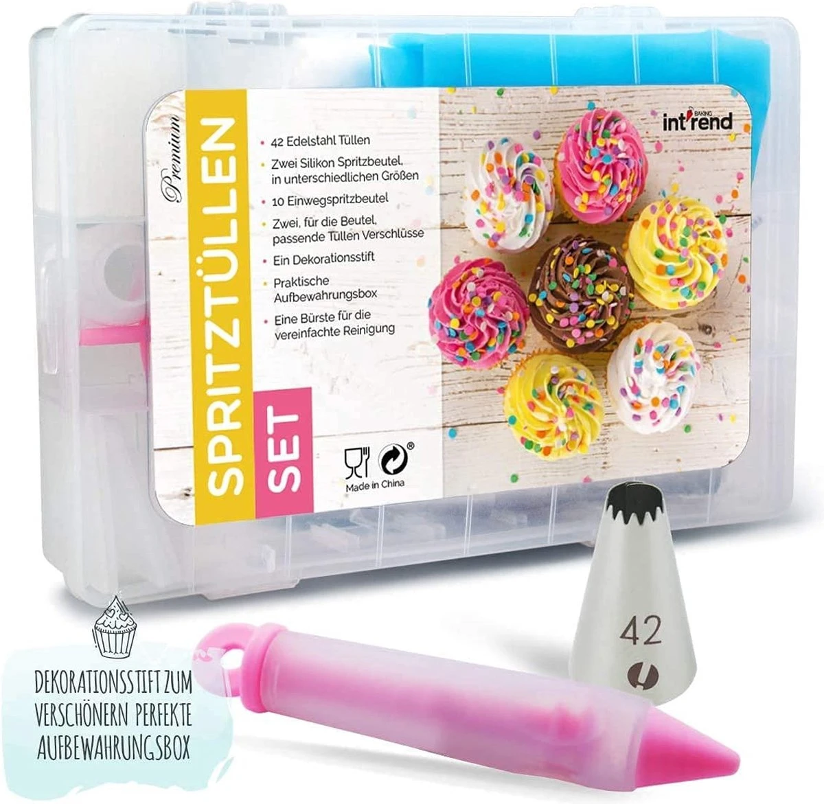 Geniet van een plezierige baktijd: hier bij int!rend geloven wij dat de enige grens je fantasie is. Wij hebben alle gereedschappen die bij elkaar horen in één set samengevat. Met onze innovatieve decoratiegereedschappen kun je met je vrienden en familie genieten van een geweldige baktijd. Alle veeleisende technieken zijn met deze onmisbare tips en gereedschappen mogelijk. Uniek, gesorteerd design: van het maken van bloemblaadjes tot het opbouwen van decoraties, onze 42 verschillende spuitmonden van roestvrij staal kunnen een groot aantal taken bedekken. Elk mondstuk is genummerd, zodat je het overzicht kunt behouden en deze kunt markeren. Met deze gereedschappen kun je verschillende patronen creëren op cupcakes, cakes, gebak, taarten en koekjes. Onmisbaar decoratiegereedschap: onze gereedschappen zijn er om aan je decoratiebehoeften te voldoen. Zo wordt een dessert in een handomdraai tot een blikvanger gecreëerd. Onze siliconen spuitzak is duurzaam en rekbaar genoeg om onder druk niet te barsten. De set wordt geleverd met een opbergdoos, waarin de gereedschappen goed kunnen worden verdeeld om ze eenvoudig en netjes op te bergen.